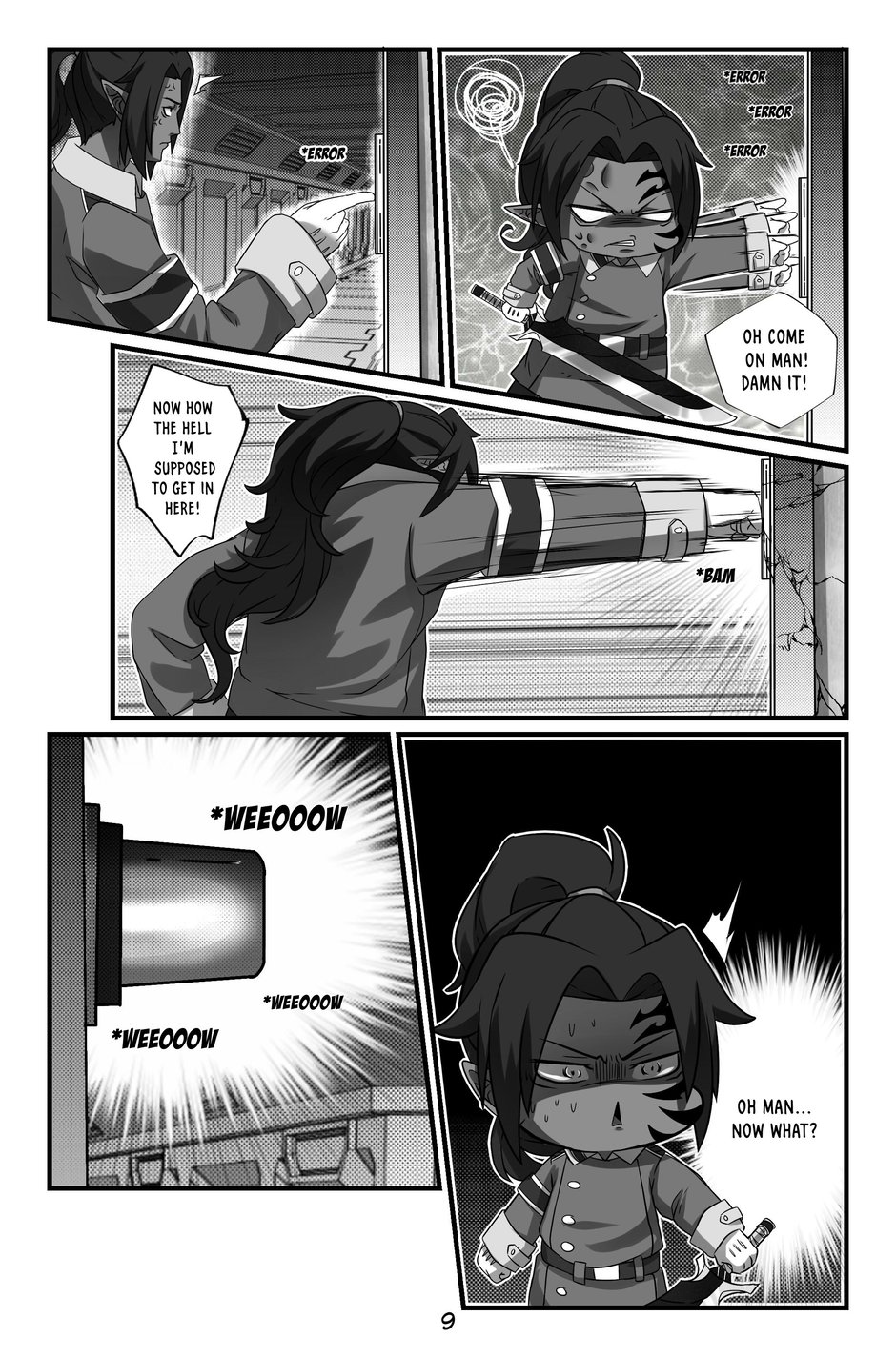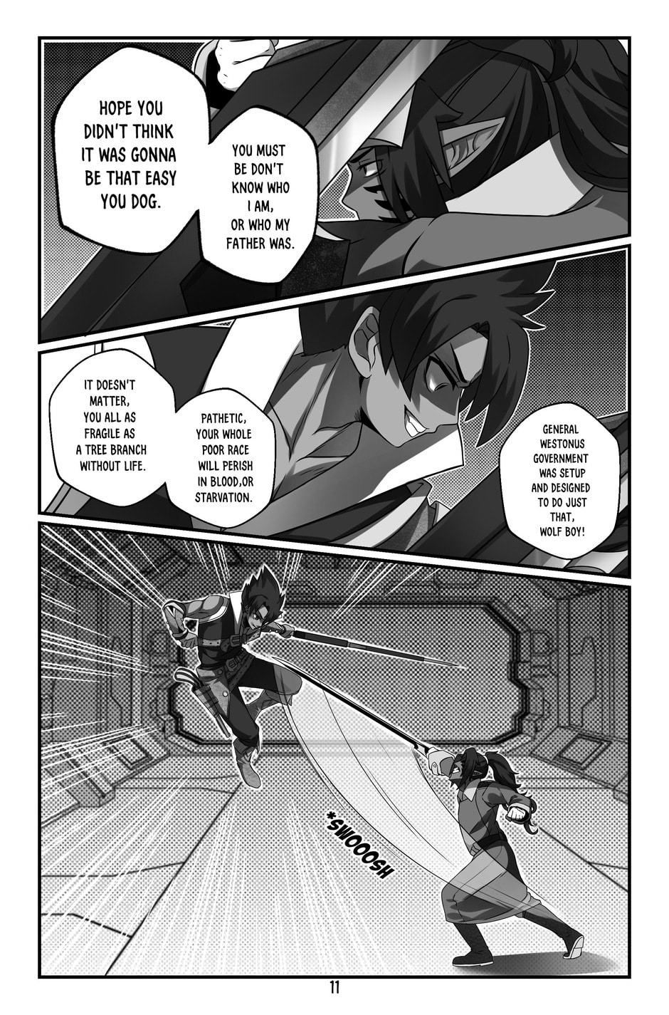 Quinn hears screaming and discovers a man with a tail like his, wounded and dying. The man, Jeikero, reveals that his daughter Bella has been killed by the heartless elites. Quinn introduces himself as a warrior of the Light Wolf Bloodline and realizes Jeikero is also a fellow Light Wolf. Jeikero gives Quinn his powerful sword, warning him about the elites' special silver bullets that prevent wounds from healing. Jeikero passes away, and Quinn promises to avenge their people and carries out his final wish.