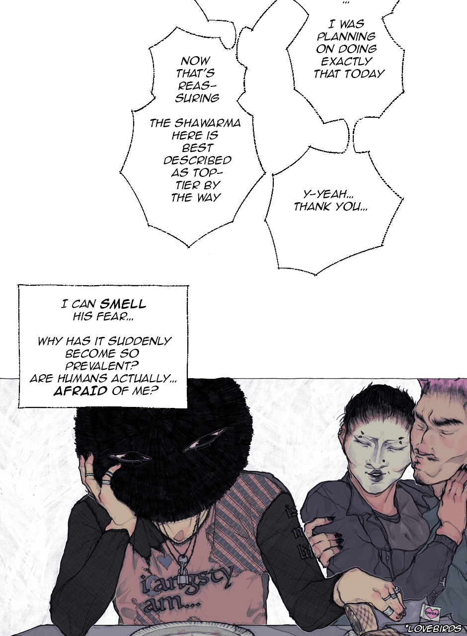 Slava is a 19 y.o living in a seemingly regular city located in the middle of nowhere. It's isolated because it has been flooded with demons (the Nechest) for centuries. Slava is half Nechest, half human, and because of tensions between the two kinds, he hasn't gotten to know the Nechest world properly. Though in his demon form (the Hyka) he's been interacting with humans for most of his life, making this his beloved hobby. His life as he knew it quickly changes though, as he finds out that more and more nechest in his home city are disappearing…