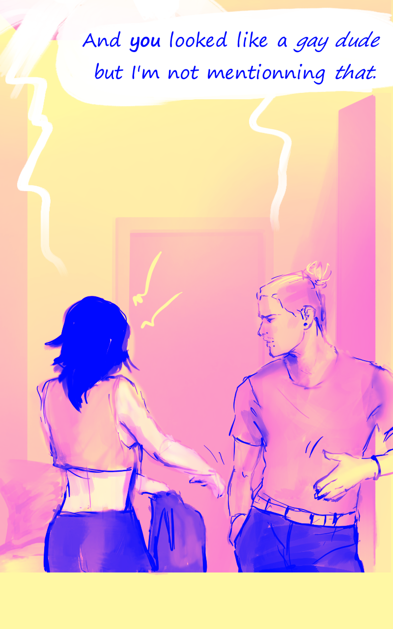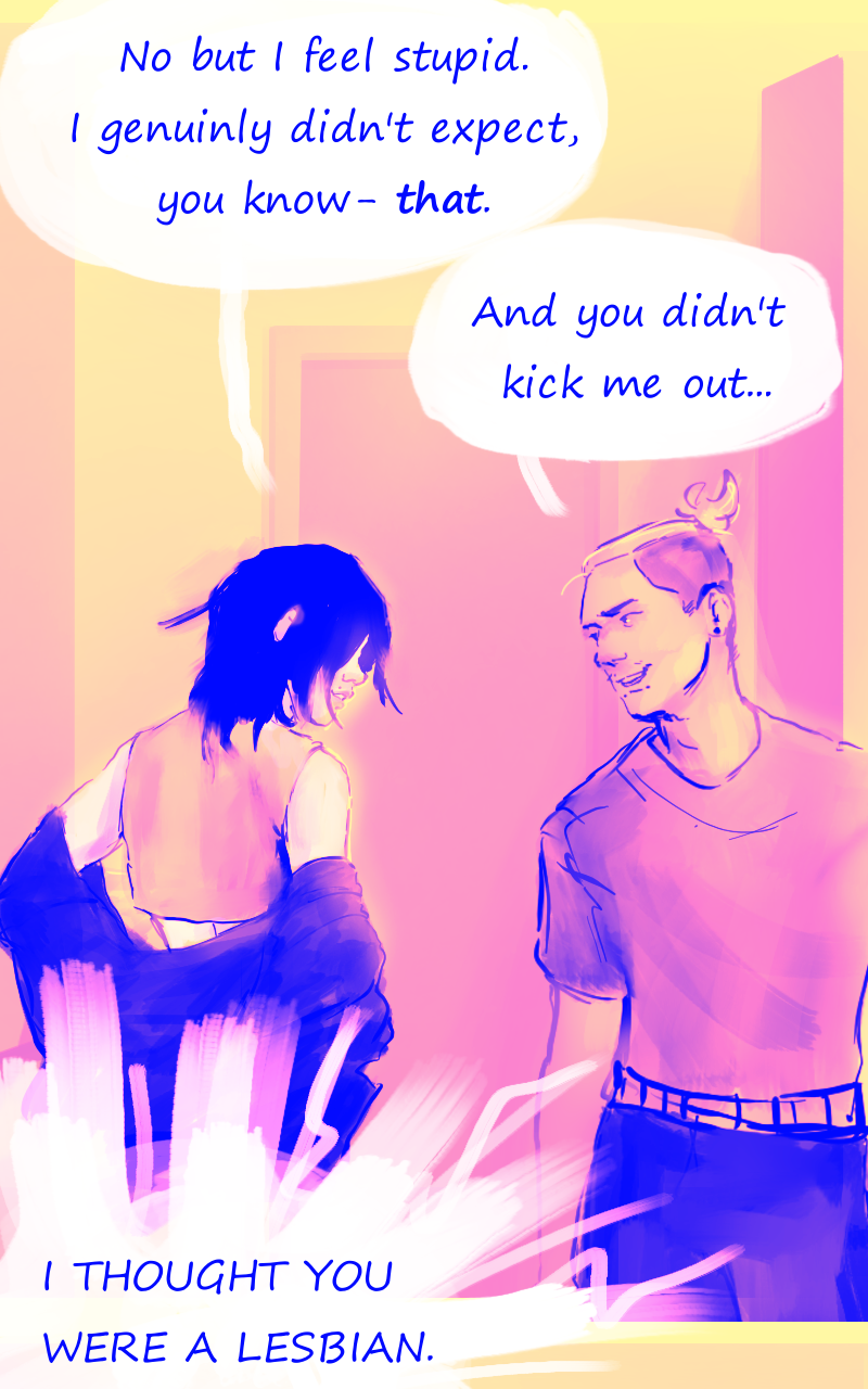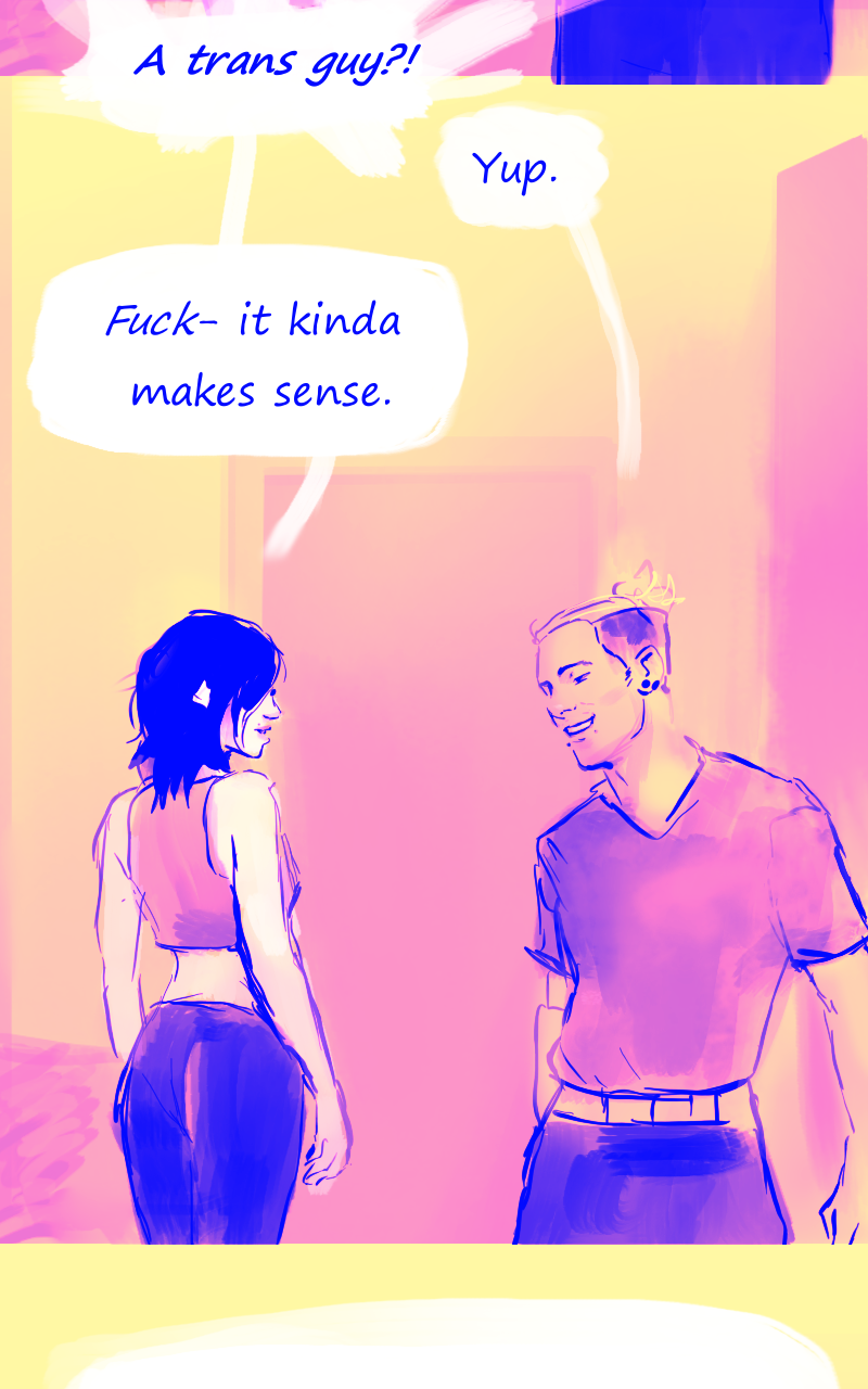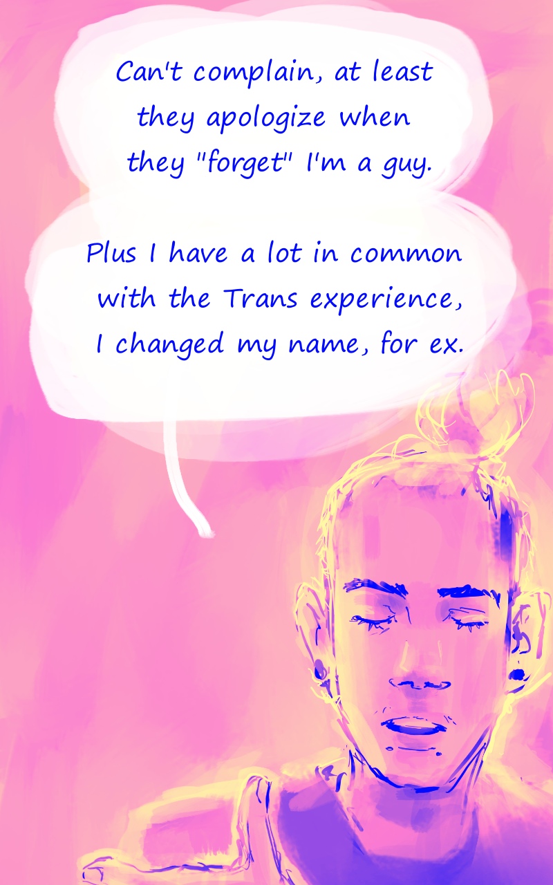Louka, illustrator : this is awkward. Syn : I am still baffled, he's been living a double life for years, apparenly *everyone* is persuaded he's *not cis* (also, the pictures are mad cute hehe)