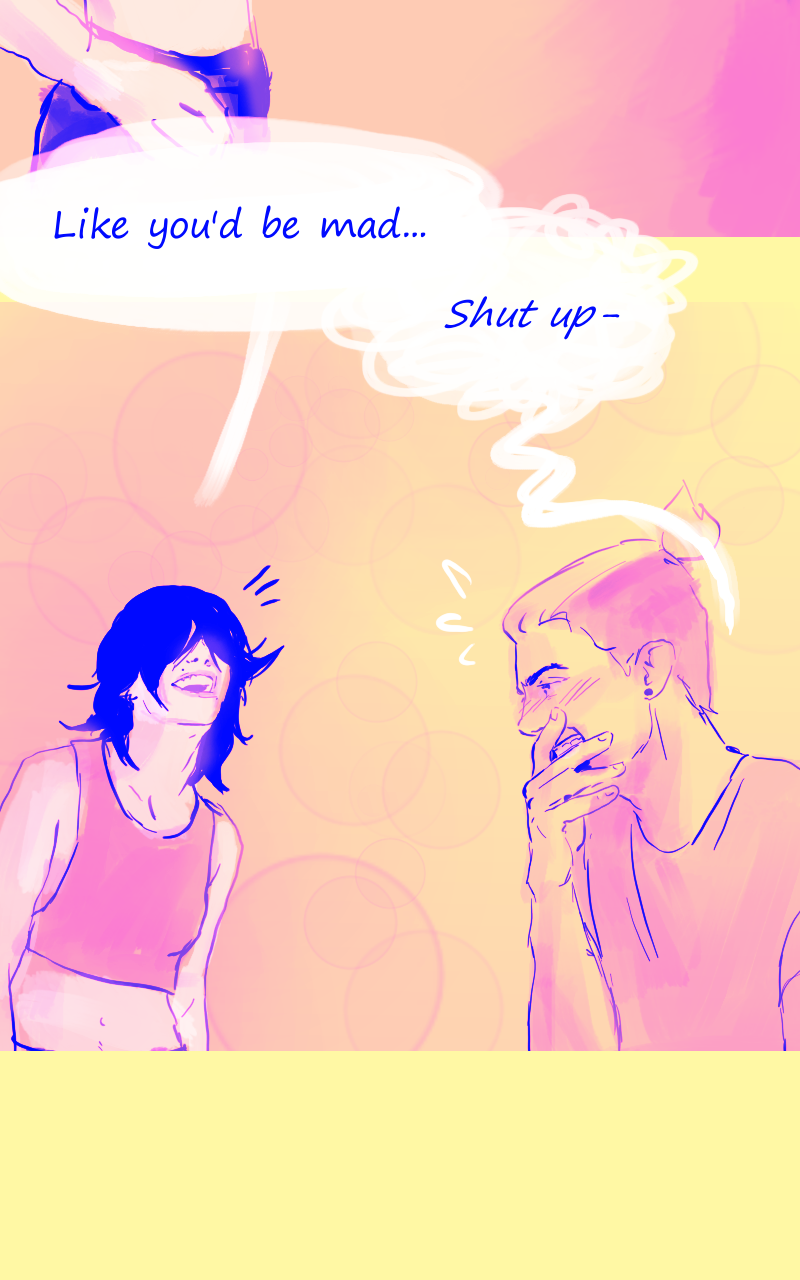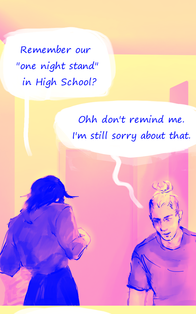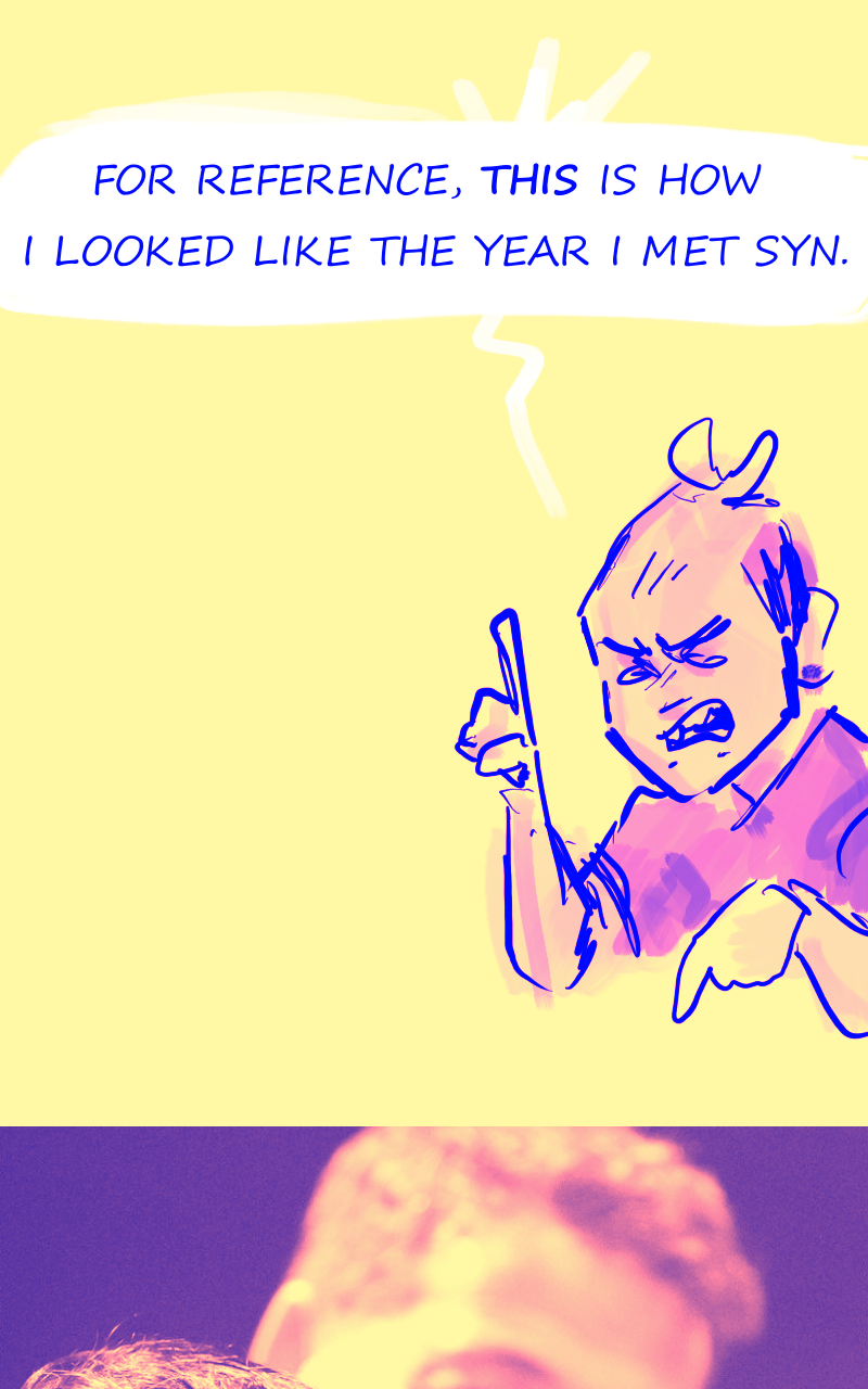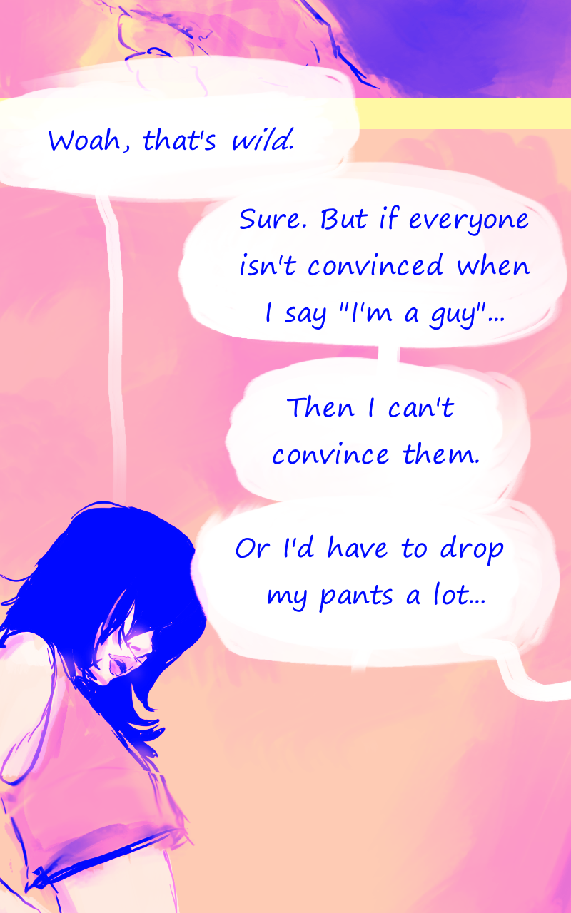 Louka, illustrator : this is awkward. Syn : I am still baffled, he's been living a double life for years, apparenly *everyone* is persuaded he's *not cis* (also, the pictures are mad cute hehe)
