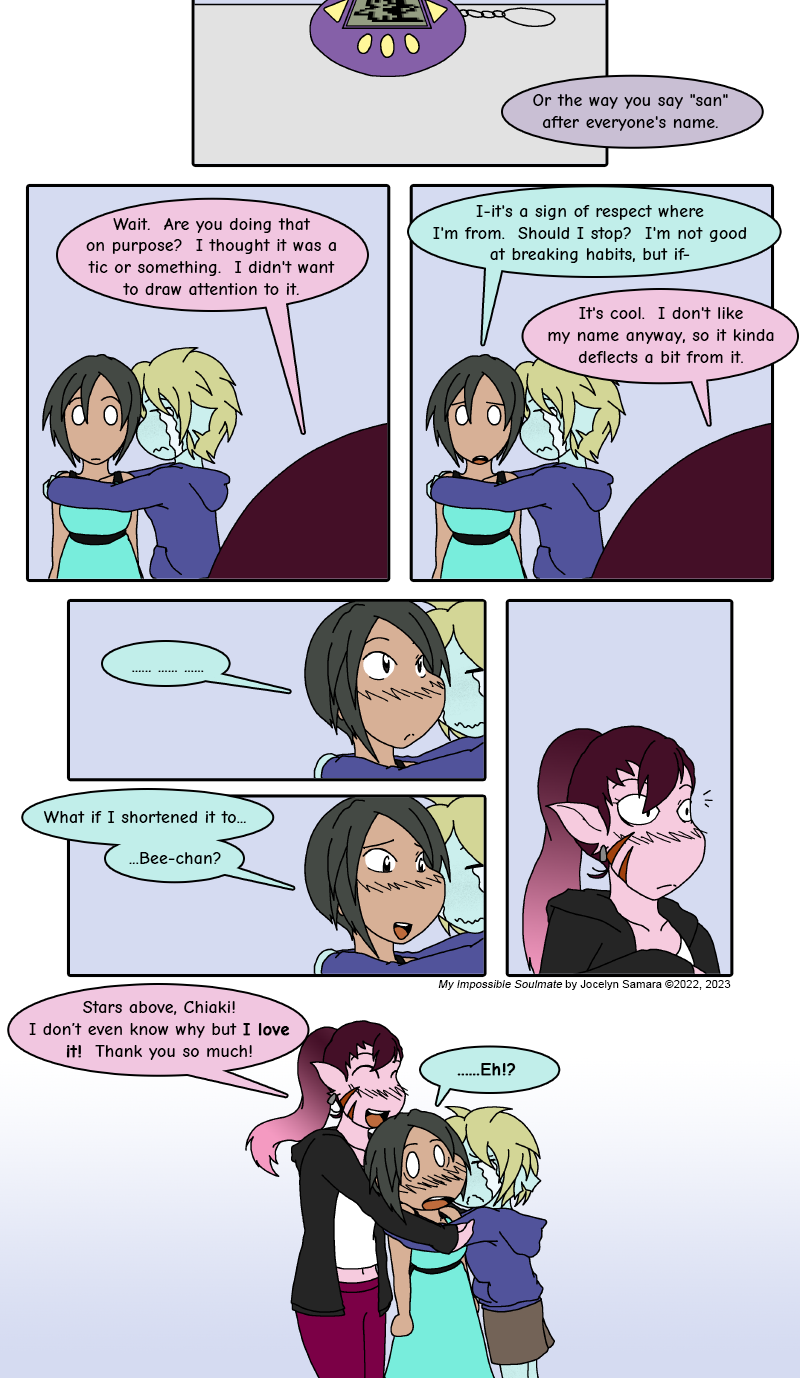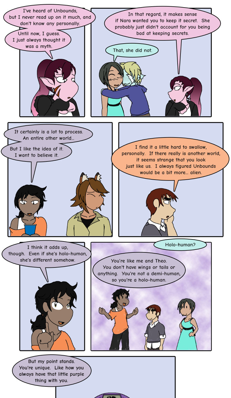Also, holo-human finally gets canonically defined (I explained it in a past blurb, but I wanted to make sure it got into the dialogue too!). It was first mentioned at the beginning of the chapter when I realized I'd need a specific word for this. And to reiterate, it is basically just the term to describe anyone who isn't demi-human (holo means "whole", demi means "half"). That said, do bear in mind that holo-humans and demi-humans alike all classify as humans.