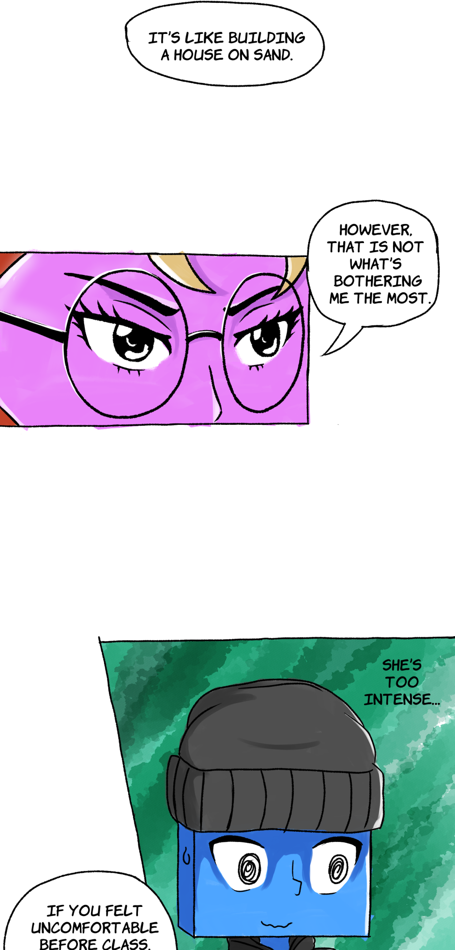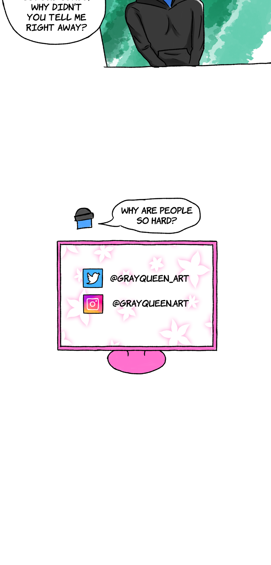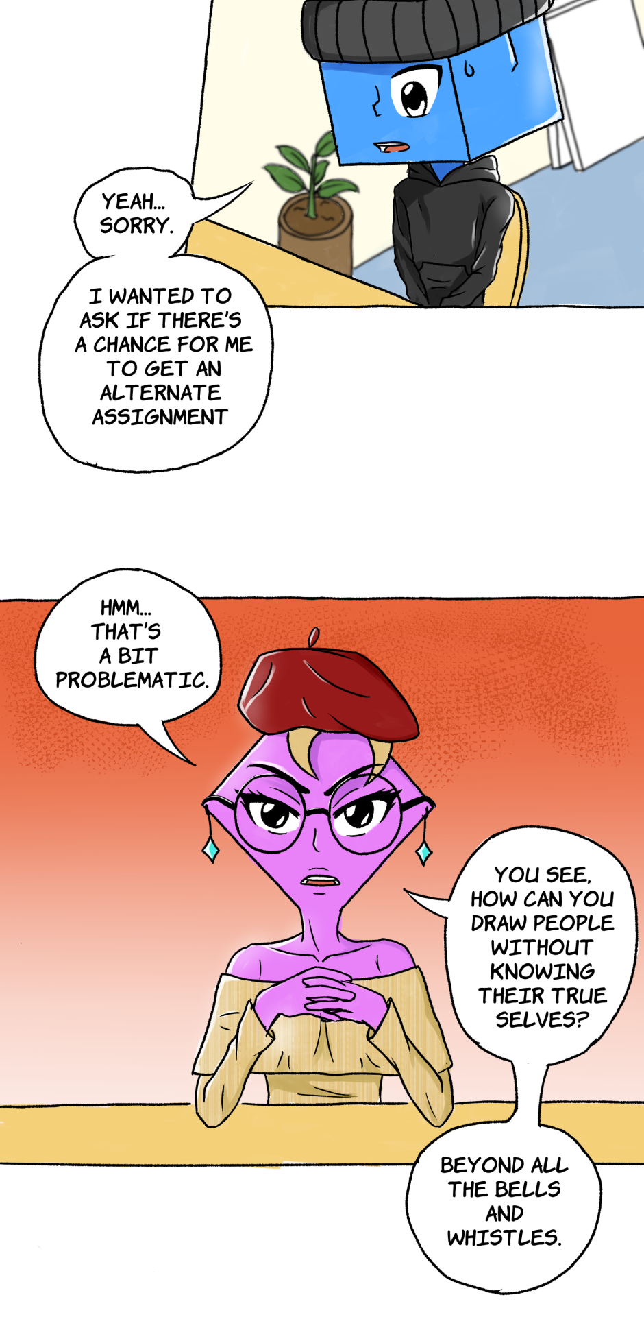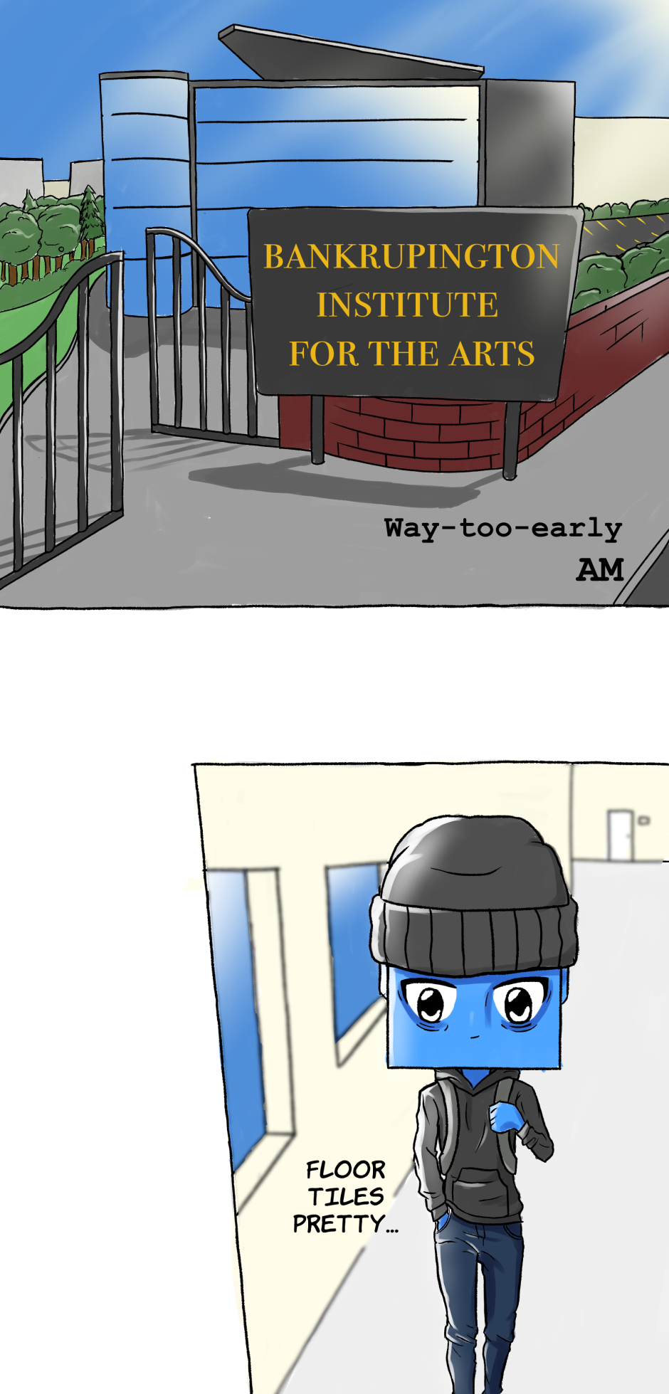 Square was living his perfect art school life: art block, gay anxiety, disapproving parents, never-ending assignments, crippling student debt, self-imposed complete social isolation… But then Circle just had to come in and mess everything up. Follow their heartwarming and *not yet* award-winning journey to, hopefully, one day, become *actual* adults.
