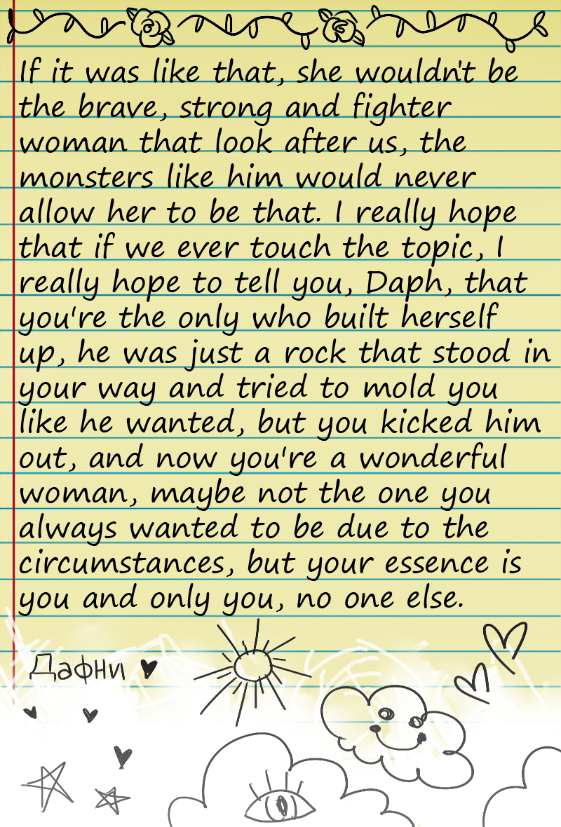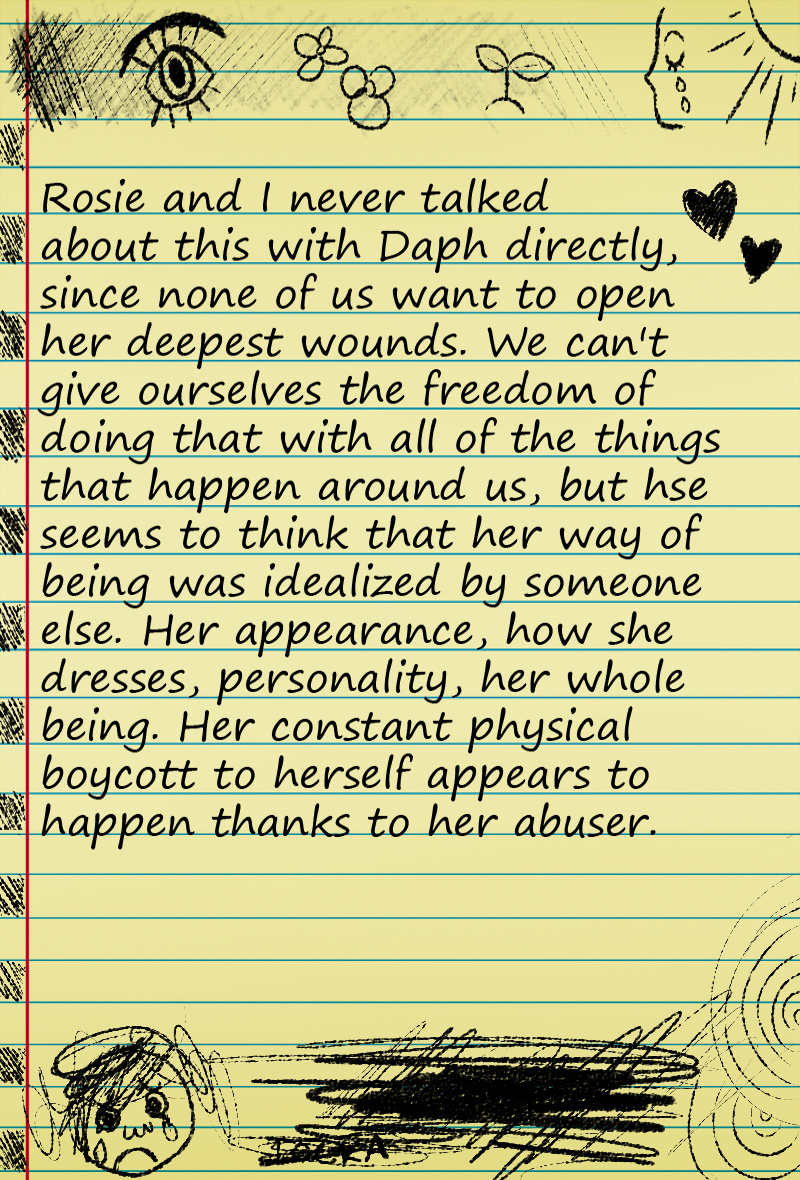 Samantha finally has a new diary where she can write. In its pages, it recapitulates many aspects of her life and personal tastes. In some of the entries we can discover how much she loves orchids, and, in other ones, we relive her most sordid memories and experiences, like that time she was snatched from her home and never returned.