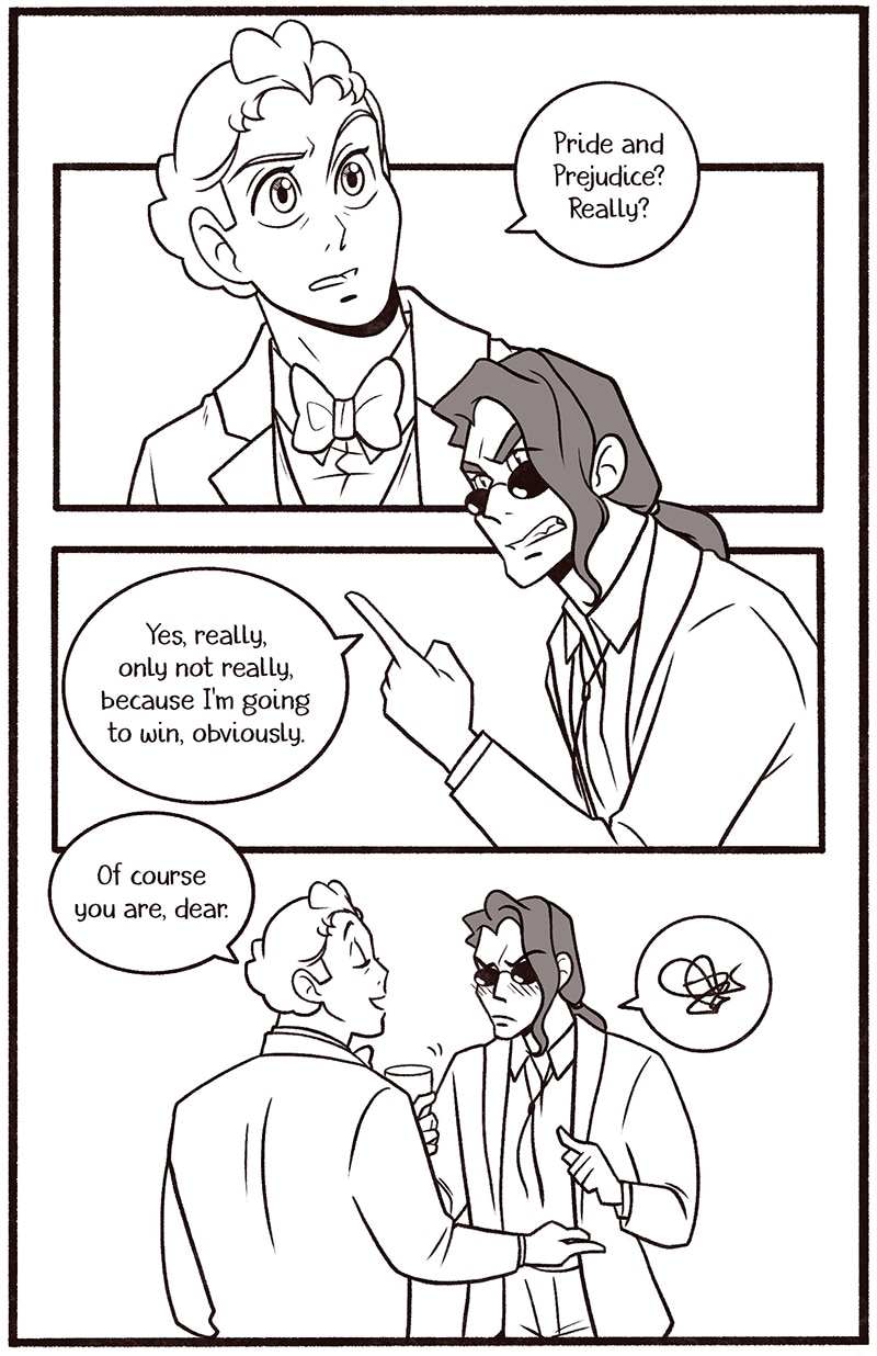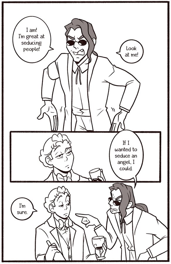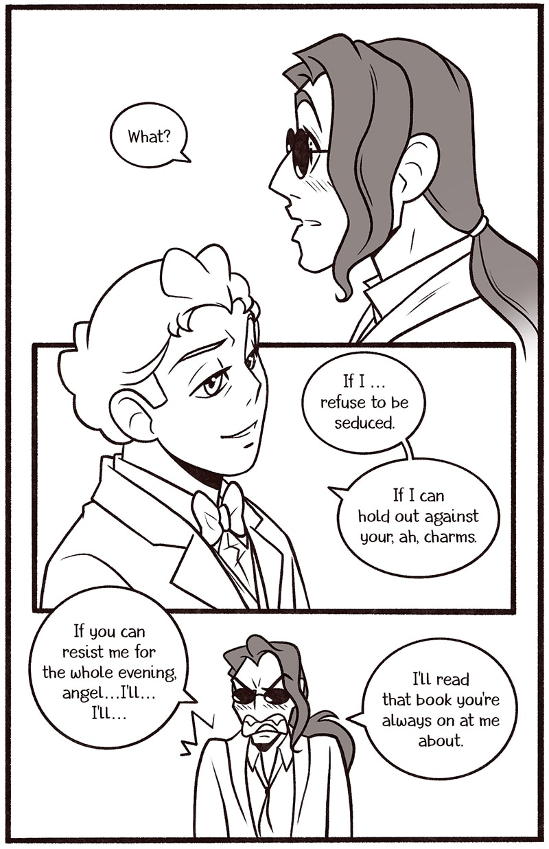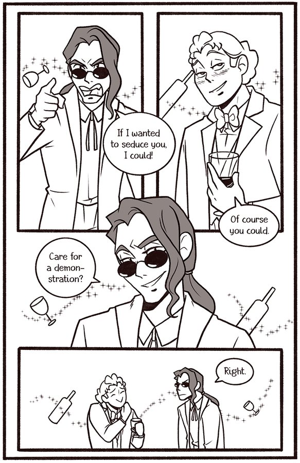 Welcome to my newest Good Omens comic One Night in Bangor (And the World’s Your Oyster). The explicit fic is written by Atalan, which you can read here: https://archiveofourown.org/works/20053450?view_adult=true.
