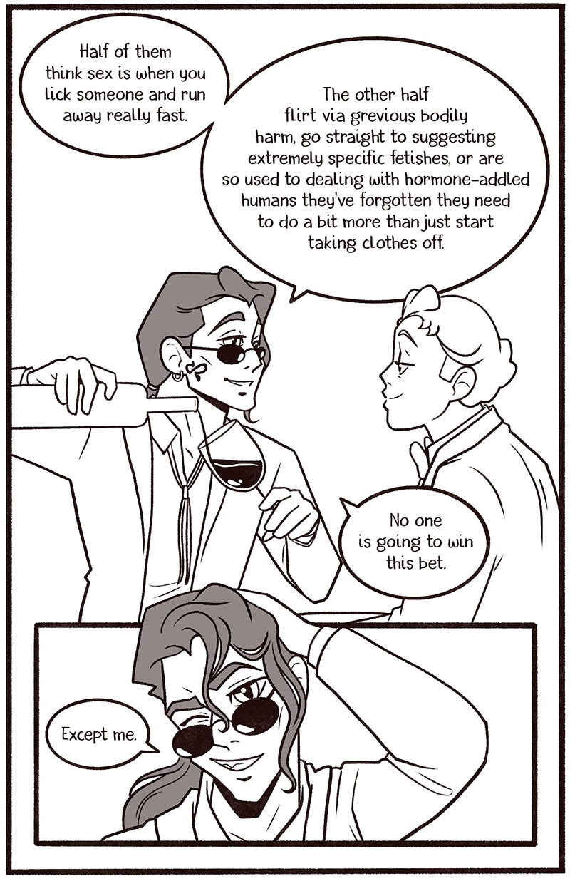 The SFW ending of this comic will be posted on Tapas. NSFW pages (the ending) will be posted to my Patreon. The SFW ending will be cohesive. Updates will be daily here until I catch up with my current page number. I will then update every Monday/Wednesday. Thanks so much for joining me!