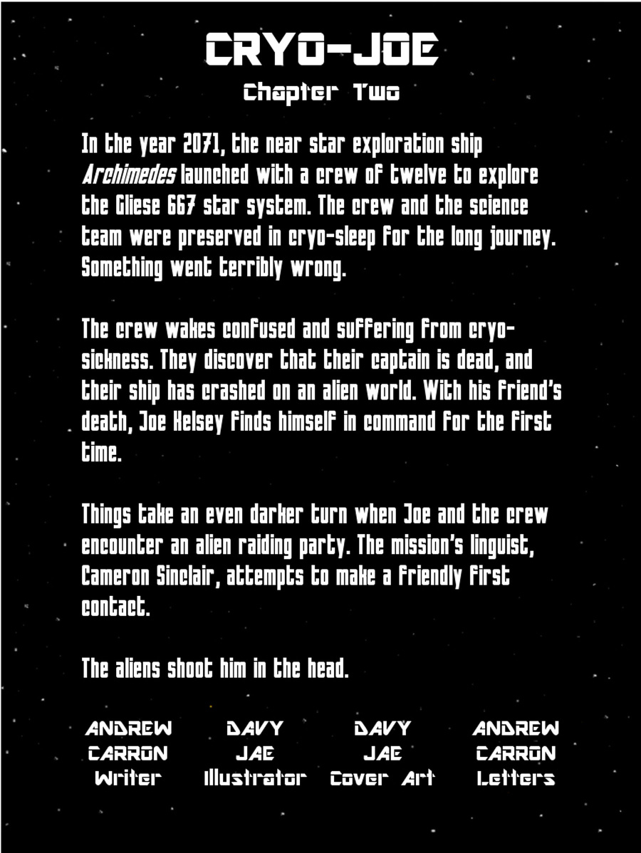 Chapter 2 picks up immediately following the events of Chapter 1. Joe's crew mate, Cam has been shot in the head by the unknown aliens that have boarded the human's crashed ship.