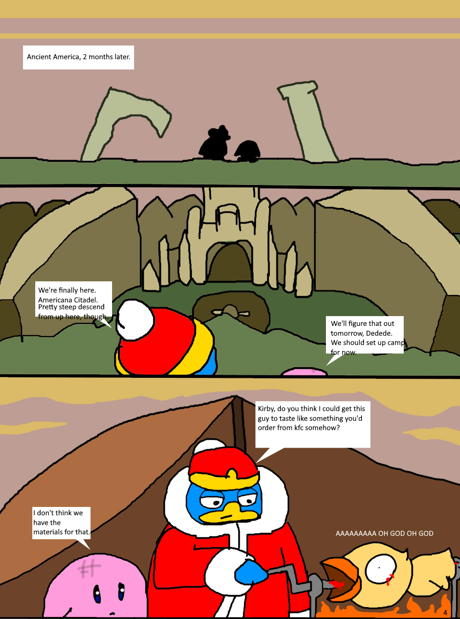 Dedede and Kirby travel to the ruins of Americana Citadel, found deep within in the ancient lands of America. But, perhaps more than just their mission, is promptly cut short.