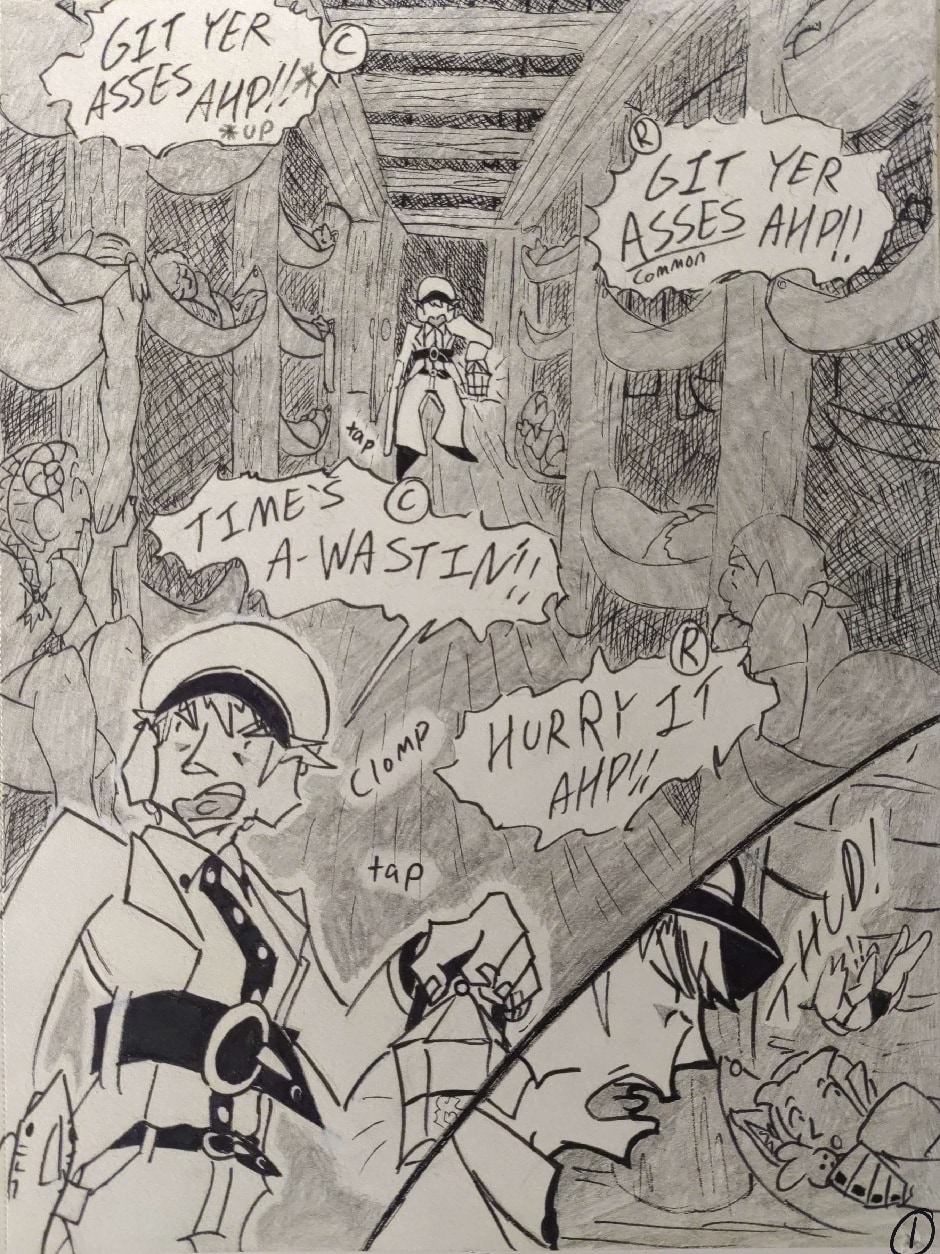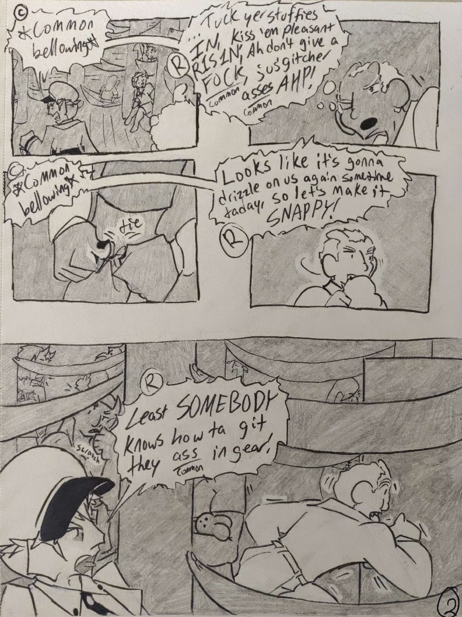 Adapted from my writing on the Siliren roleplay forum, Currituck Itavi's sailorly seananigans set sail aboard Organized Sailing Ship Day-Seizer in comic form! Follow the ambitious and joyful Hellbend sailor Currituck and his sailor besties, warm-hearted Human sailor Terry Johnson and sassy Hellbend sailor and fuckbuddy Djoomart Isanov, as they navigate the goofy saily-daily under the harsh gaze of the ship's hardass Human First Mate, Russell Denver. Join us here every Sunday (hopefully), m' mates!