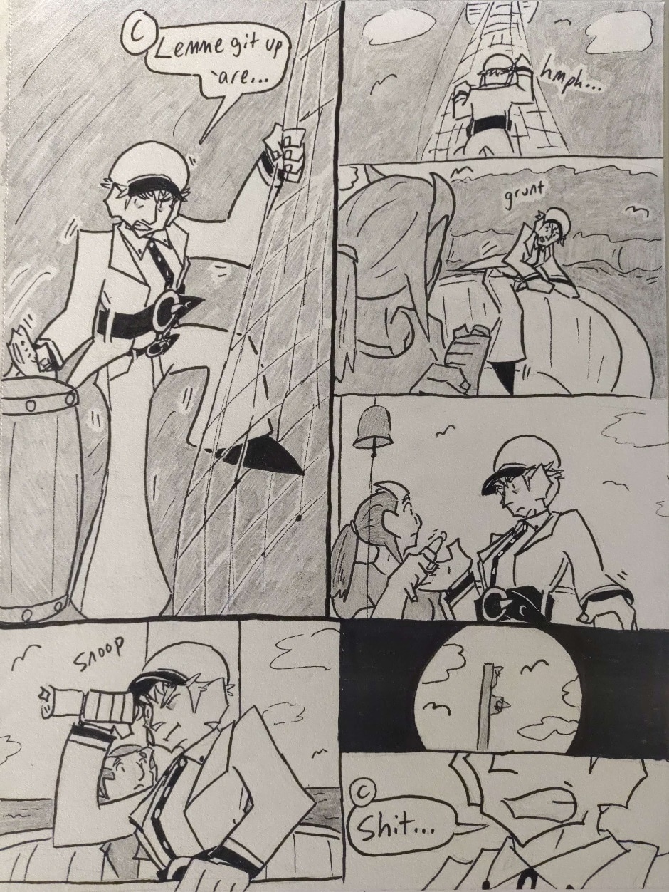 Adapted from my writing on the Siliren roleplay forum, Currituck Itavi's sailorly seananigans set sail aboard Organized Sailing Ship Day-Seizer in comic form! Follow the ambitious and joyful Hellbend sailor Currituck and his sailor besties, warm-hearted Human sailor Terry Johnson and sassy Hellbend sailor and fuckbuddy Djoomart Isanov, as they navigate the goofy saily-daily under the harsh gaze of the ship's hardass Human First Mate, Russell Denver. Join us here every Sunday (hopefully), m' mates!