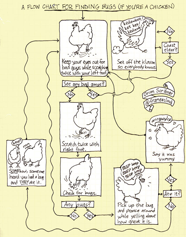 1. “A flow chart for finding bugs (if you’re a chicken).” Go to 2.