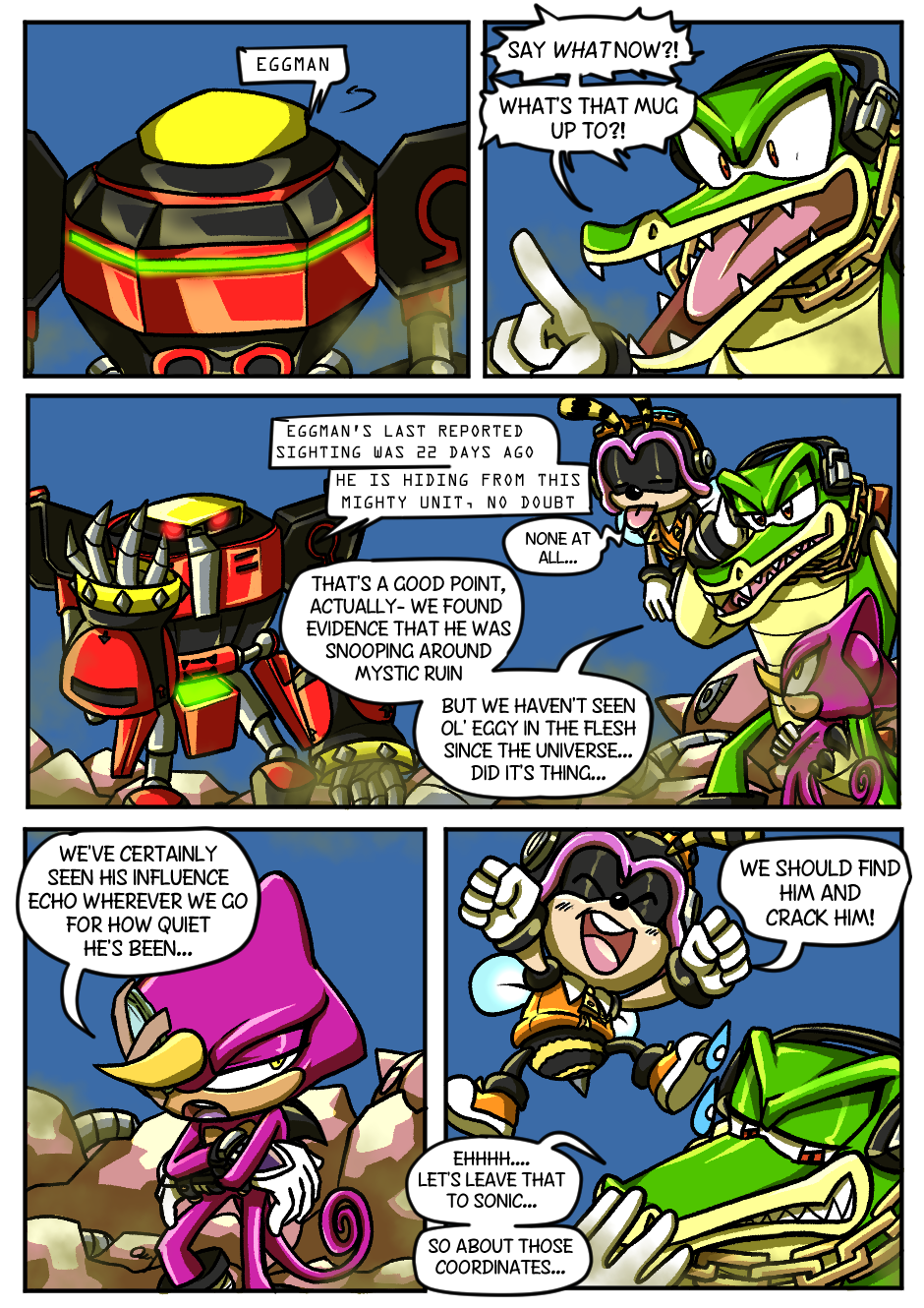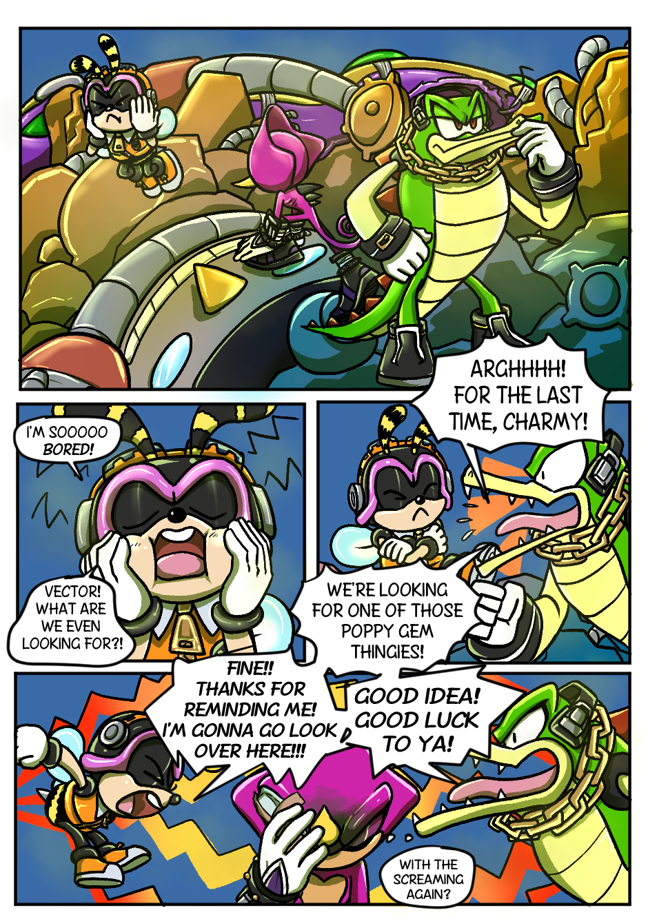 The Chaotix lick their wounds in the Robot Graveyard, hoping helping Sonic find those weird music rocks might get their spirits up.