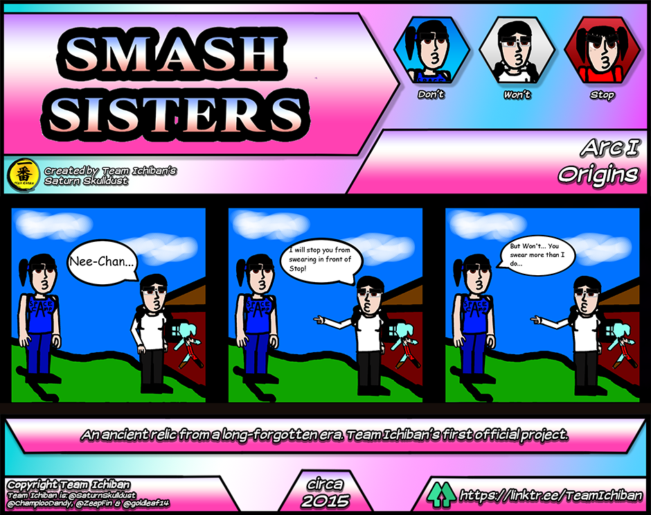 Smash Sisters! is the first webcomic ever created by Team Ichiban's Saturn Skulldust. This strange, pseudo-canon "prequel" to Kureiji Yababa!!! (Classic) is now coming to Tapas! Smash Sisters! stars the Ryujima sisters' predecessors, the Higashikata girls. Confronted by the evil machinations of their crotchety old neighbors, its up to them to bring peace back to their sleepy hometown.