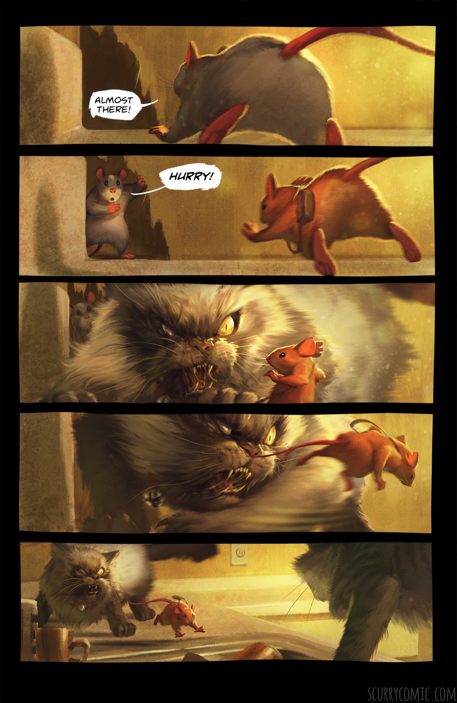Scurry is a dark fantasy animal comic about a colony of mice in an abandoned house who are struggling to survive a long, strange winter. Being hunted by feral cats and predatory birds is part of life for these mice, but beyond the fences stalks something far more fearsome...