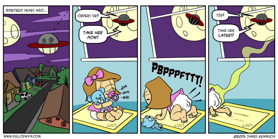 The trouble with abducting a baby, especially when the baby is alien to you, is that you don’t know what you’re getting into. Most human parents would admit the same thing, if their pride would allow it, after bringing home their bundle of joy. The puking, peeing, screaming, pooping… it’s a lot more than Gerber commercials prepared any of us for. Add the alien aspect and well, you’re in for some trouble. At least they have enough sense to wait until after someone has changed her.