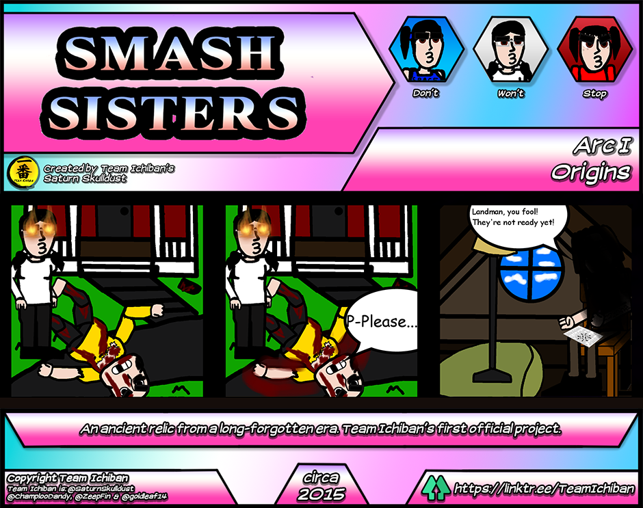 Smash Sisters! is the first webcomic ever created by Team Ichiban's Saturn Skulldust. This strange, pseudo-canon "prequel" to Kureiji Yababa!!! (Classic) is now coming to Tapas! Smash Sisters! stars the Ryujima sisters' predecessors, the Higashikata girls. Confronted by the evil machinations of their crotchety old neighbors, its up to them to bring peace back to their sleepy hometown.