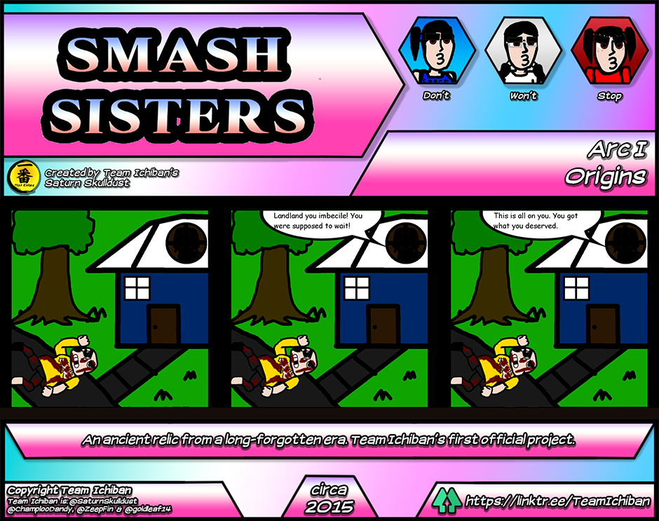 Smash Sisters! is the first webcomic ever created by Team Ichiban's Saturn Skulldust. This strange, pseudo-canon "prequel" to Kureiji Yababa!!! (Classic) is now coming to Tapas! Smash Sisters! stars the Ryujima sisters' predecessors, the Higashikata girls. Confronted by the evil machinations of their crotchety old neighbors, its up to them to bring peace back to their sleepy hometown.