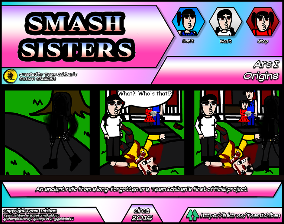 Smash Sisters! is the first webcomic ever created by Team Ichiban's Saturn Skulldust. This strange, pseudo-canon "prequel" to Kureiji Yababa!!! (Classic) is now coming to Tapas! Smash Sisters! stars the Ryujima sisters' predecessors, the Higashikata girls. Confronted by the evil machinations of their crotchety old neighbors, its up to them to bring peace back to their sleepy hometown.