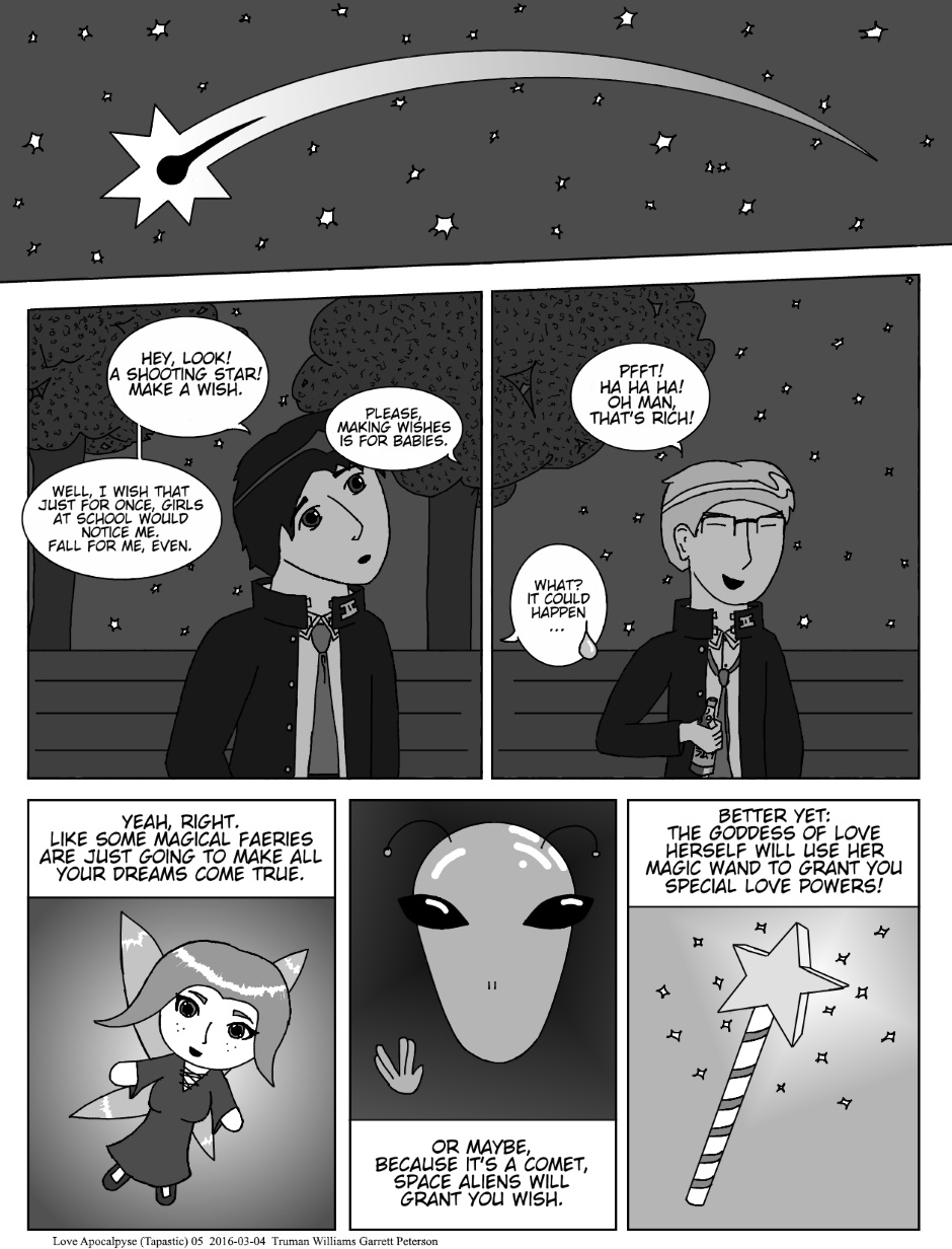 This is the first comic that I worked on, mainly doing the art while Truman wrote it. It released on Smackjeeves as [T&G’s] Love Apocalypse from May 7th 2013 to August 9th 2015, totaling in 63 pages, plus extras. The first page is being released on the main character’s birthday: February 28th.