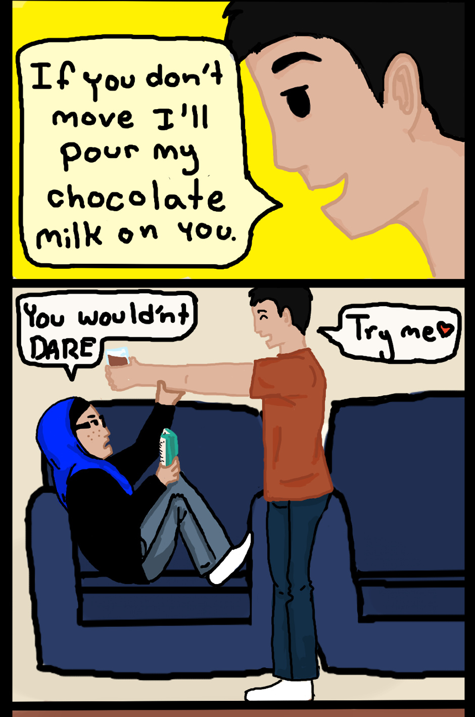This is my younger brother. Never test my younger brother in a game of chicken. You. Will. Lose. (My head smelt like chocolate milk for 2 days ;_;) Anyone else have a sibling like this or am I just cursed?