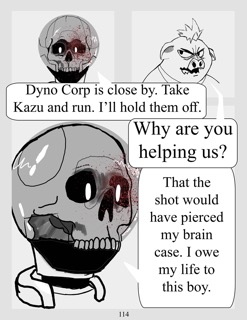 Uta flees Dyno corp carrying Kazu injured.