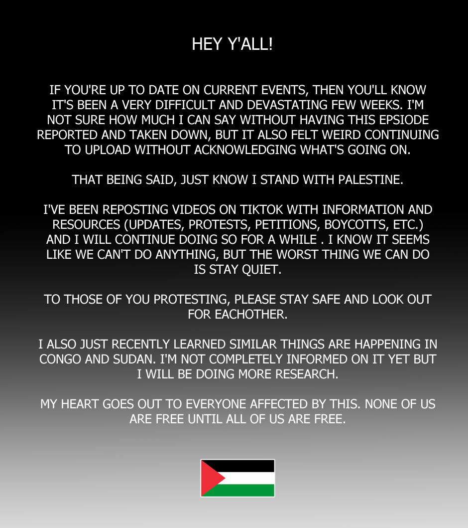 updates are gonna be slow for a while (as y'all could already tell) but I hope my comic can give y'all a little bit of a break every now and then as long as we don't ignore what's going on and remember that being able to take a break from this is a privilege the people of Gaza do not have.