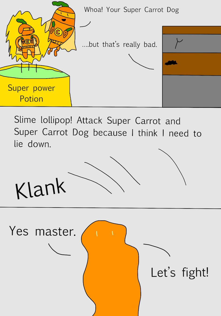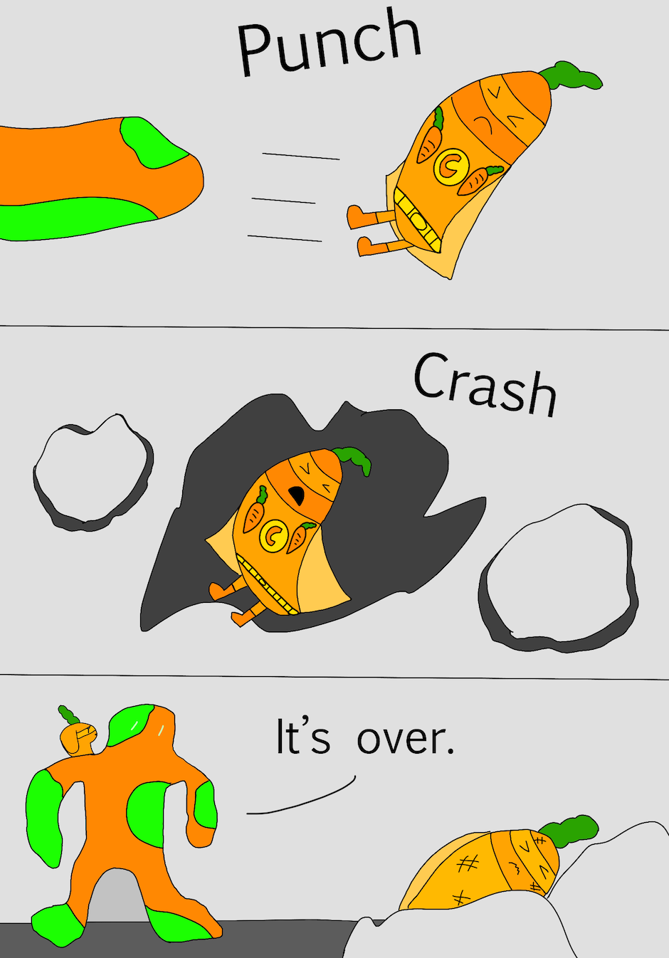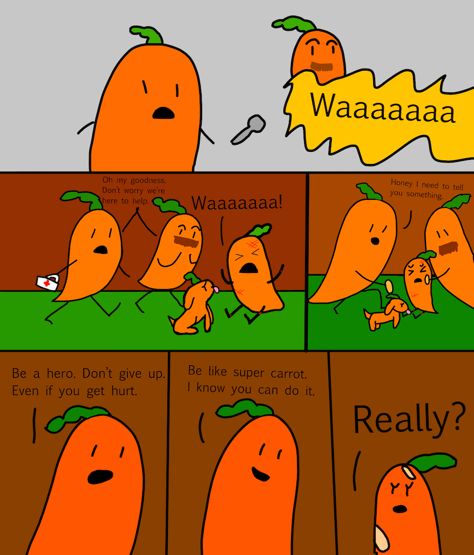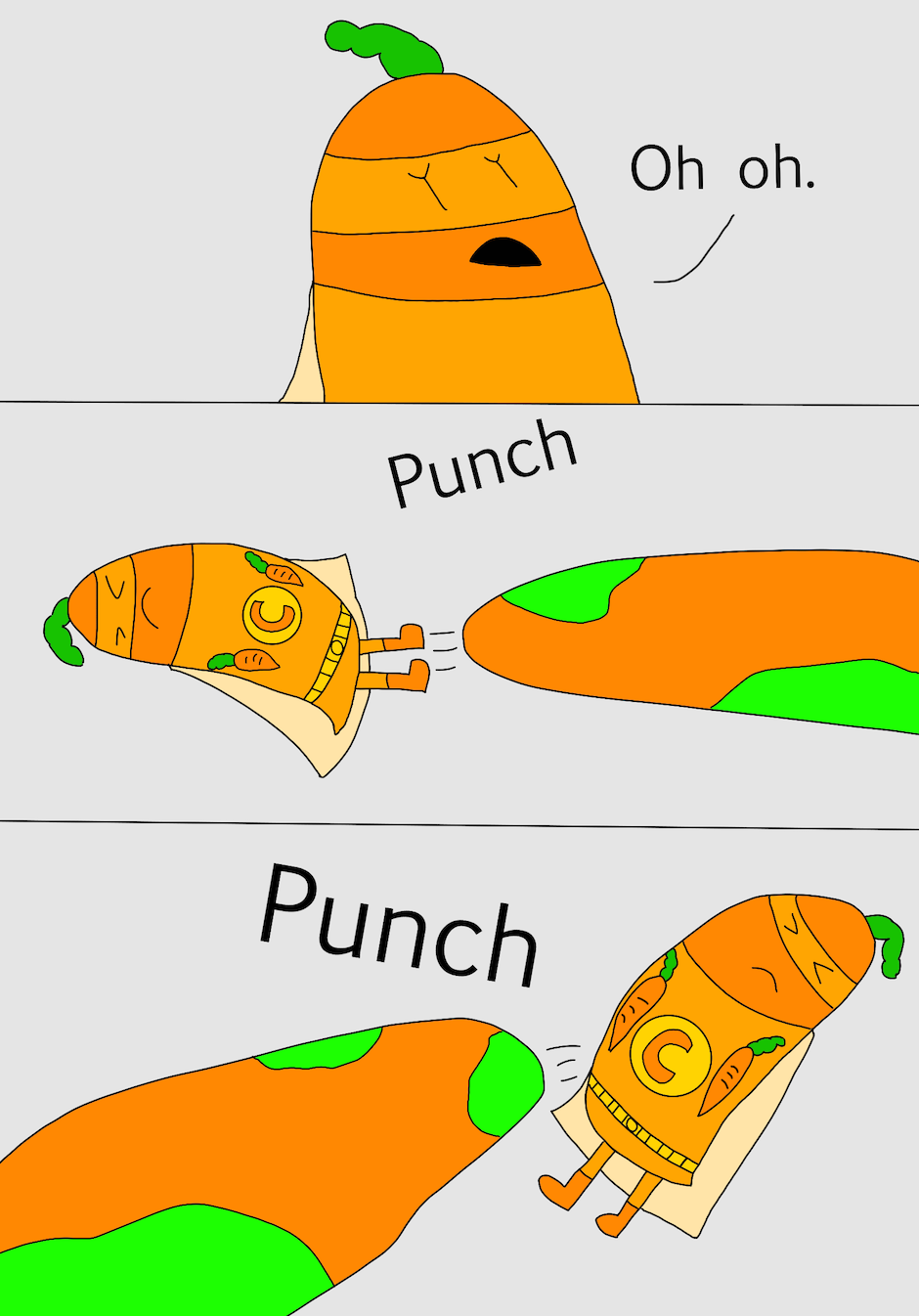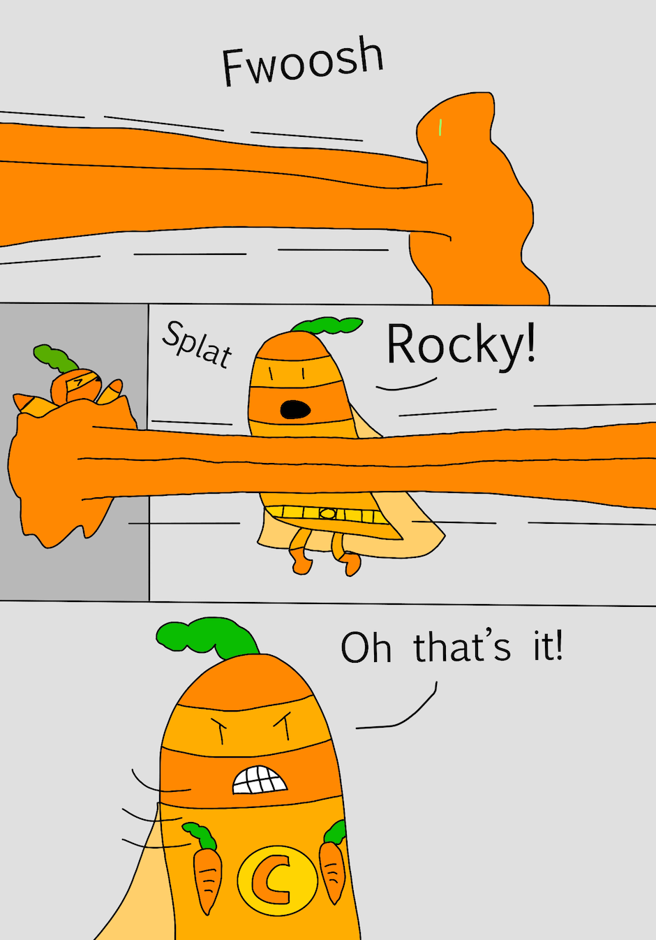 Hi, my name is Jane and I am 9 years old. This book is about a little carrot who became a hero. There was a villain who wanted to take over the world. The villain had two evil friends that helped him with his evil plan. It was up to the little carrot to safe the world. Can our hero little carrot beat the evil villain or will he lose?