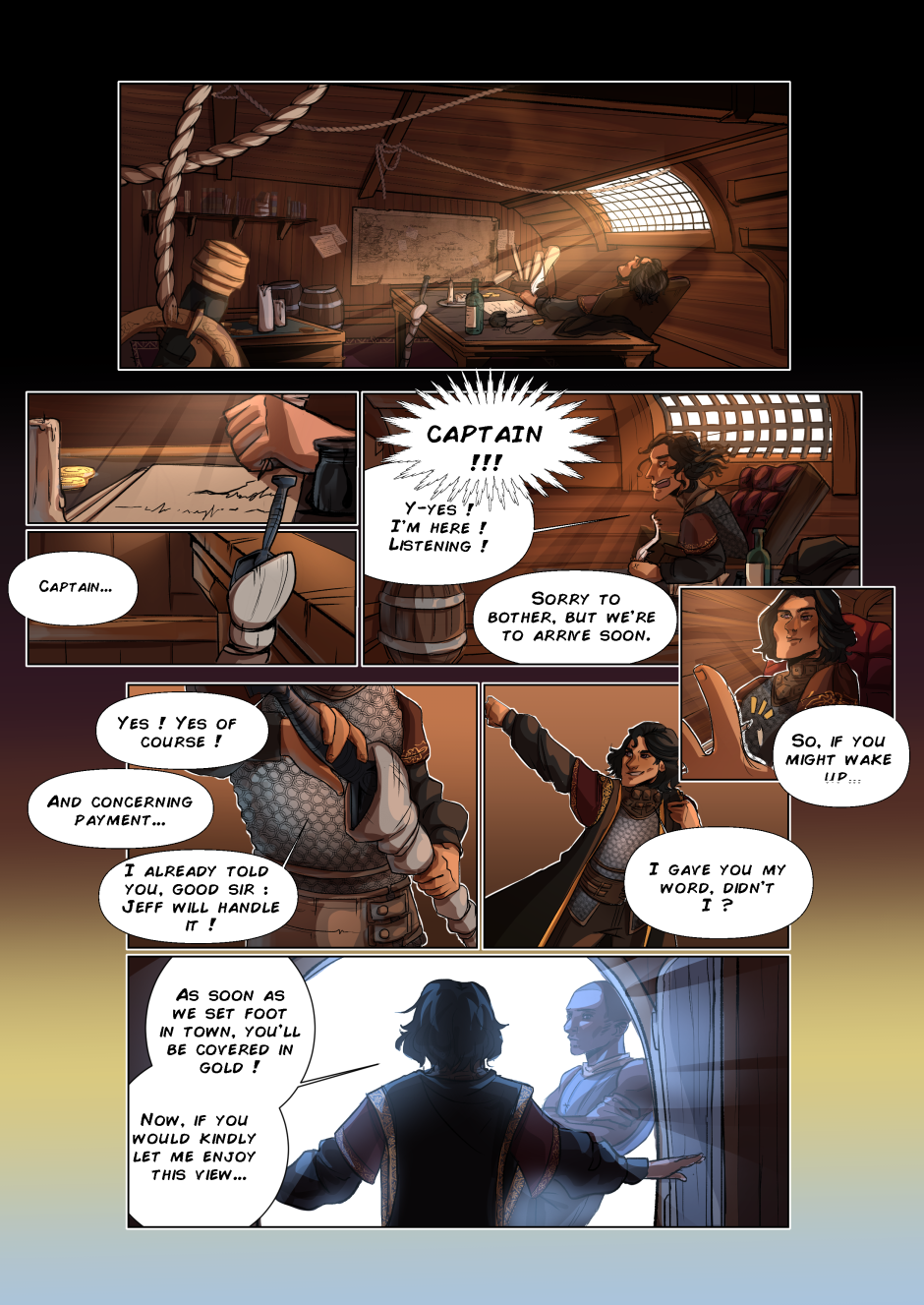 My only issue with this page is David looks different in all three of his panels, which disturbs me a little haha. Otherwise it's pretty efficient as an introduction, and I could focus on all the cool little details (the map, the sword, it's neat)