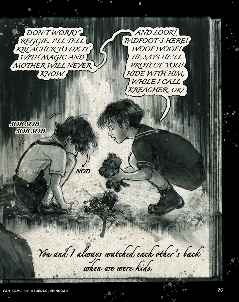 An ongoing fan comic set in the world of Harry Potter, about the brothers Regulus and Sirius Black. It's a fan fiction comic drawn and written by me, partially based on certain things mentioned in the books. It's mainly a drama and family issues plot.