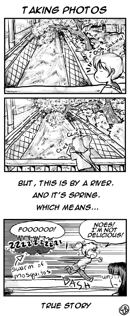 So, Sakura trees are a really big thing in the spring. Mostly, b/c it's just so darn COLD in the winter and when the sakura bloom it's this burst of color and the hope of WARMTH and GOOD WEATHER!!! Also, it's pretty incredible to see row after row of little light pink blossoms against the dark tree trunks, lining the river. So, I went out one weekend to get pictures before they all dropped off, and while I was out, the tiny, newborn mosquitoes all decided that I was DELICIOUS and all swarmed me. I'm particularly delicious to mosquitoes as it is, but it didn't help that I was insistent on getting pictures, no matter what.