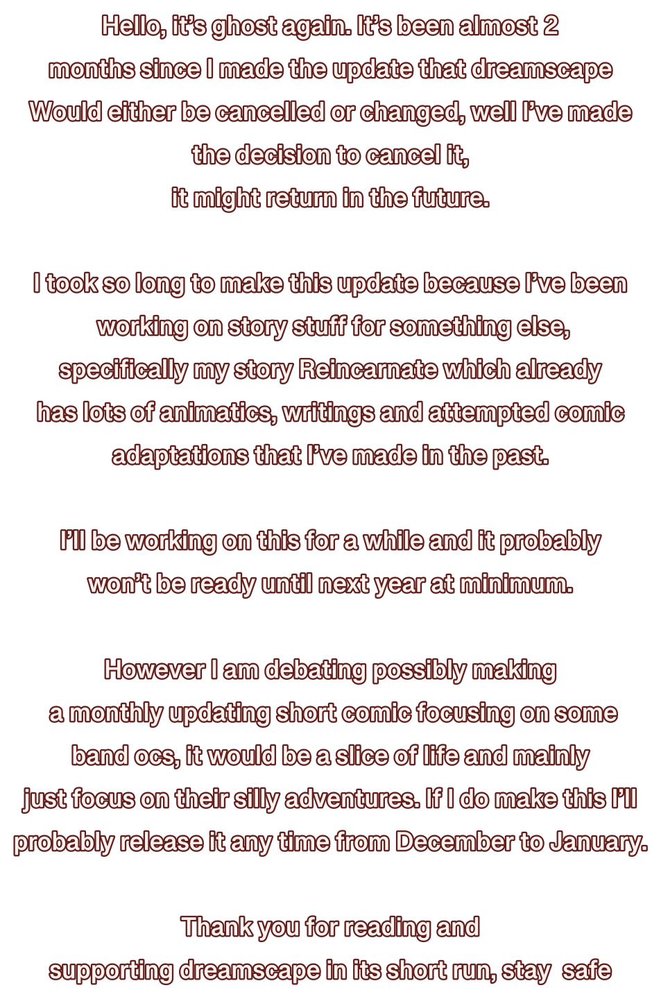 Hello, it’s ghost again. It’s been almost 2 months since I made the update that dreamscape Would either be cancelled or changed, well I’ve made the decision to cancel it, it might return in the future. I took so long to make this update because I’ve been working on story stuff for something else, specifically my story Reincarnate which already has lots of animatics, writings and attempted comic adaptations that I’ve made in the past. I’ll be working on this for a while and it probably won’t be ready until next year at minimum. However I am debating possibly making a monthly updating short comic focusing on some band ocs, it would be a slice of life and mainly just focus on their silly adventures. If I do make this I’ll probably release it any time from December to January. Thank you for reading and supporting dreamscape in its short run, stay safe