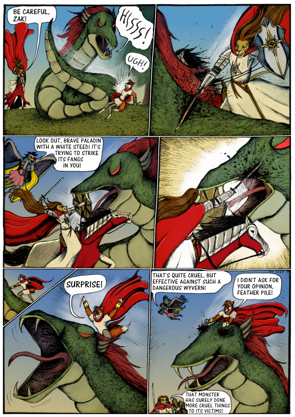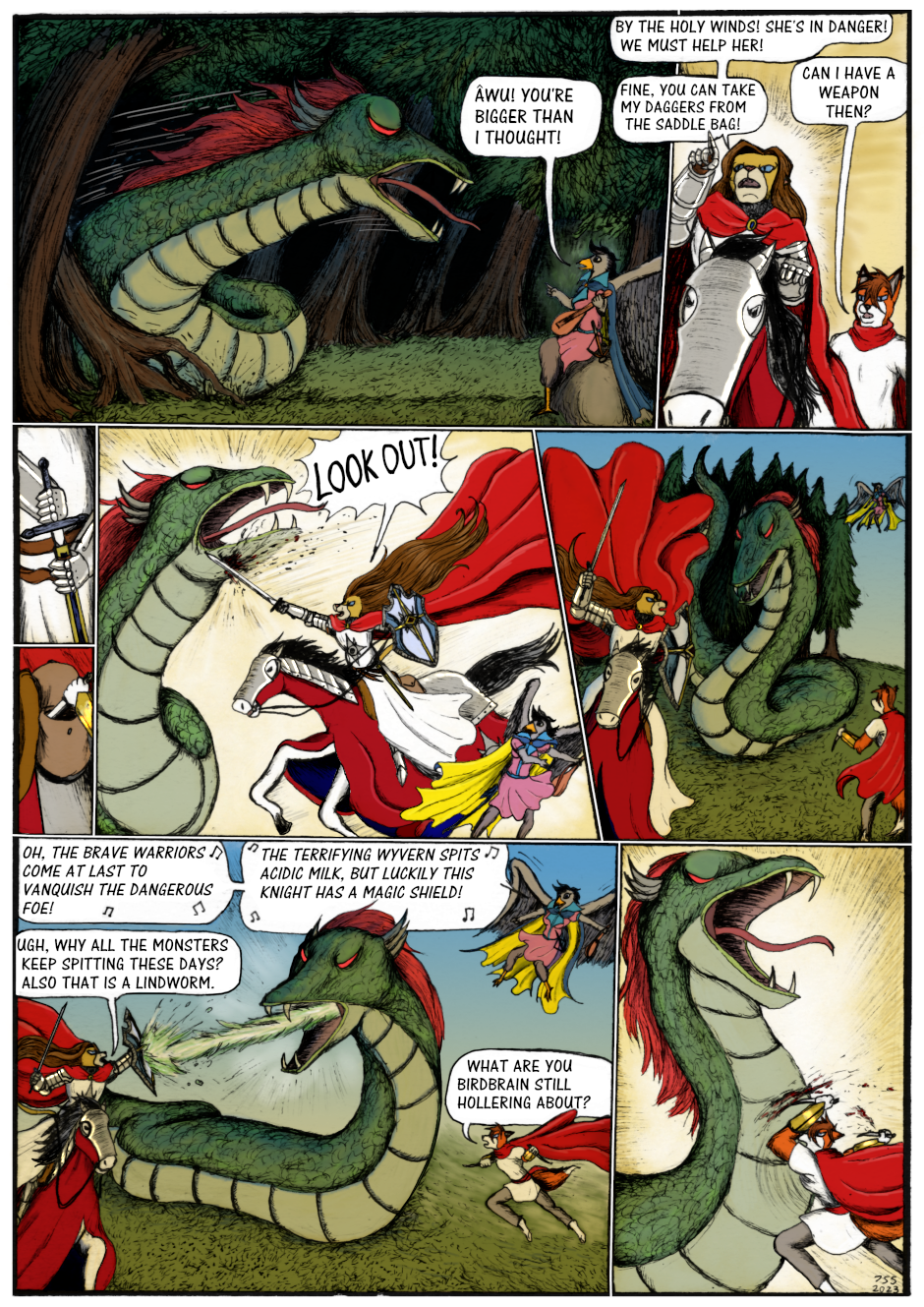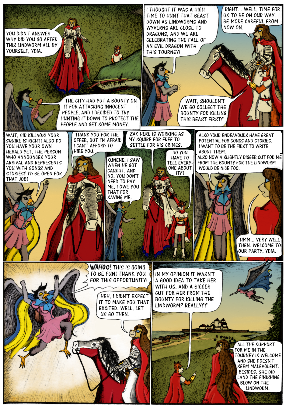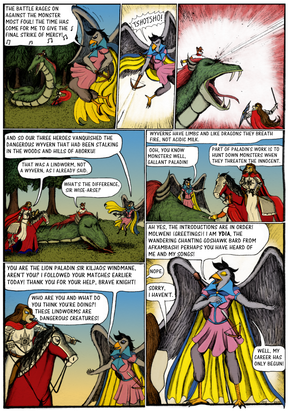 Sir Kiljaos and Zak see the mysterious bird girl getting attacked by a giant snake monster, which turns out to be a lindworm (a monster from Scandinavian mythology), and rush in to the rescue. They all together manage to vanquish this monster, and the bird girl introduces herself. She is Ydia the chanting goshawk bard from Afkambash, who has apparently just started her career as a bard and an adventurer, which led to her foolishly trying to take out the lindworm all by herself.