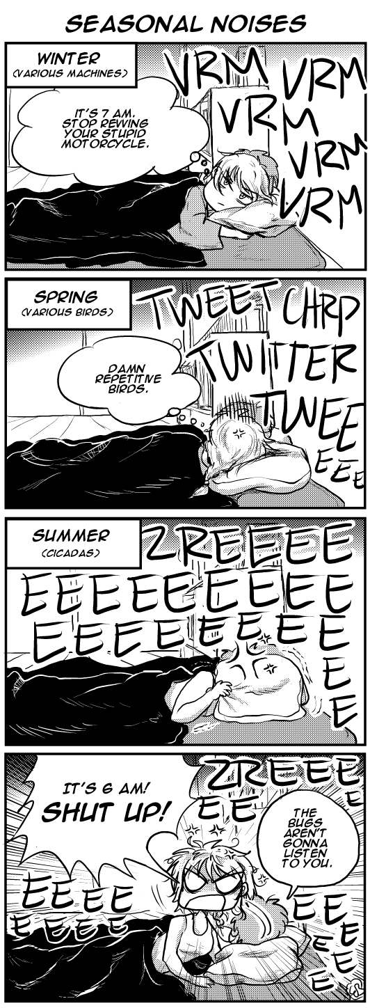 This is something that has been annoying me for the past few weeks: some noise or another will wake you up in the morning. And it tends to be seasonal. Winter is people warming their engines for, I swear, HOURS. And it's not all that cold here. Spring is the WEIRDEST birds I've ever heard (with the most repetitive calls EVER), and Summer is the cicadas. Now, the first week or so, they were kinda neat. It was the OMG I'm in Japan and it's summer time! Week two began with "gee, they're kinda loud" and this week was "ARRRGGG even with the doors closed I CAN STILL HEAR THEM". So yes.