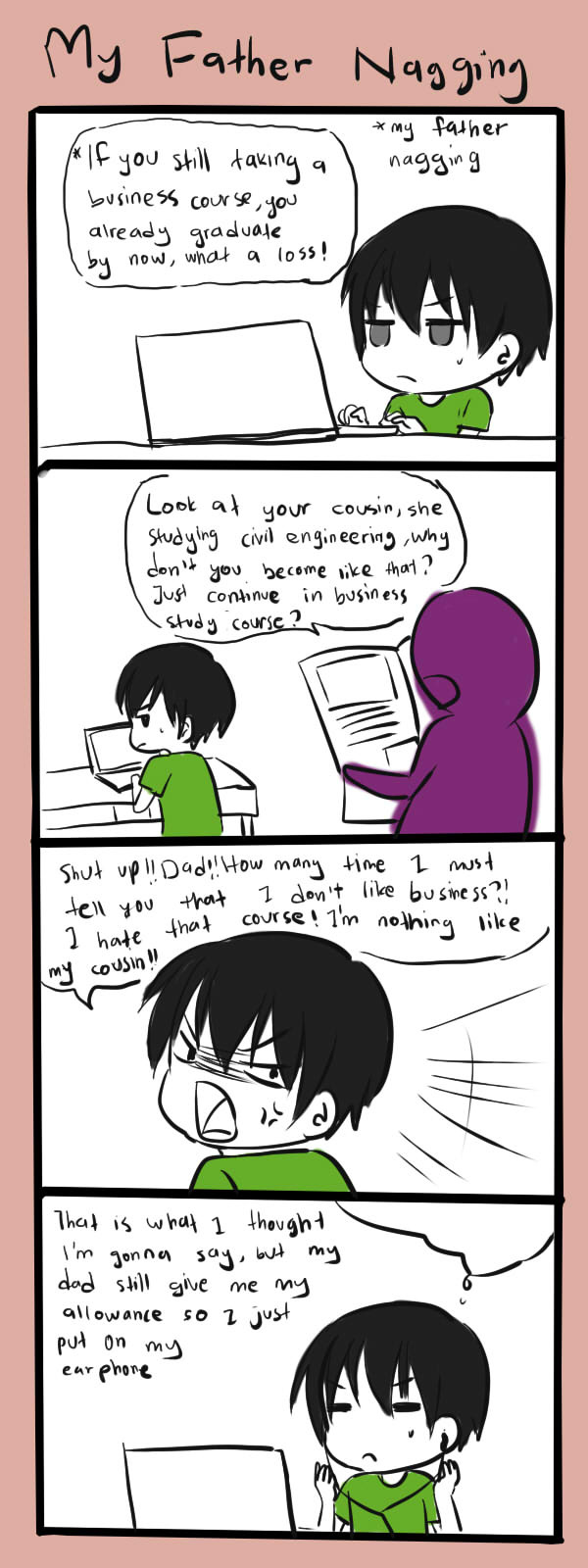 I used to taking business course before I'm studying in multimedia course, my father always against my decision and he is bragging about it until now, Its already 3 years and he still nagging about how stupid I am for quitting in business, well..I'm more interested in becoming an artist