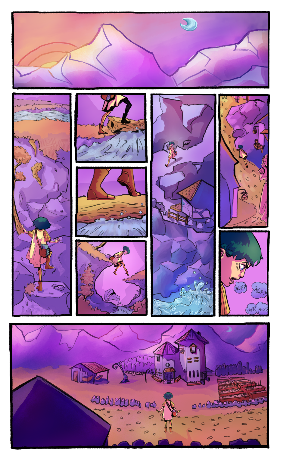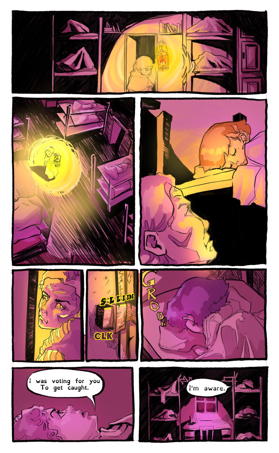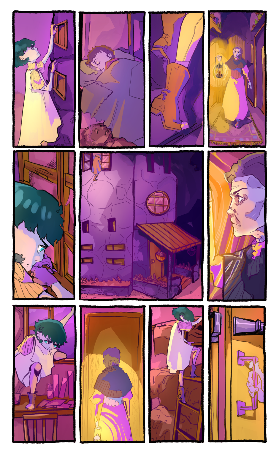 Meeting the curfew, the girl rushes into houses and get on bed. The moment is captured with intense and urgency. Well illustrated.