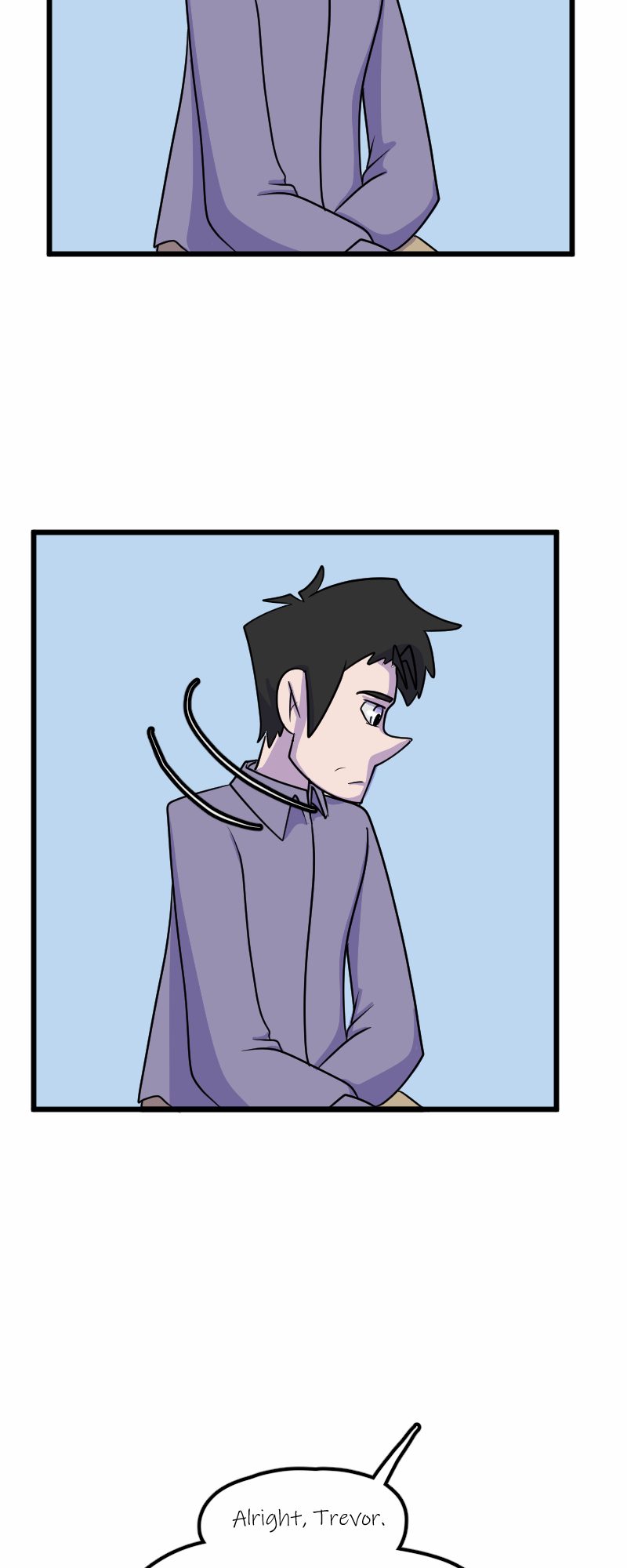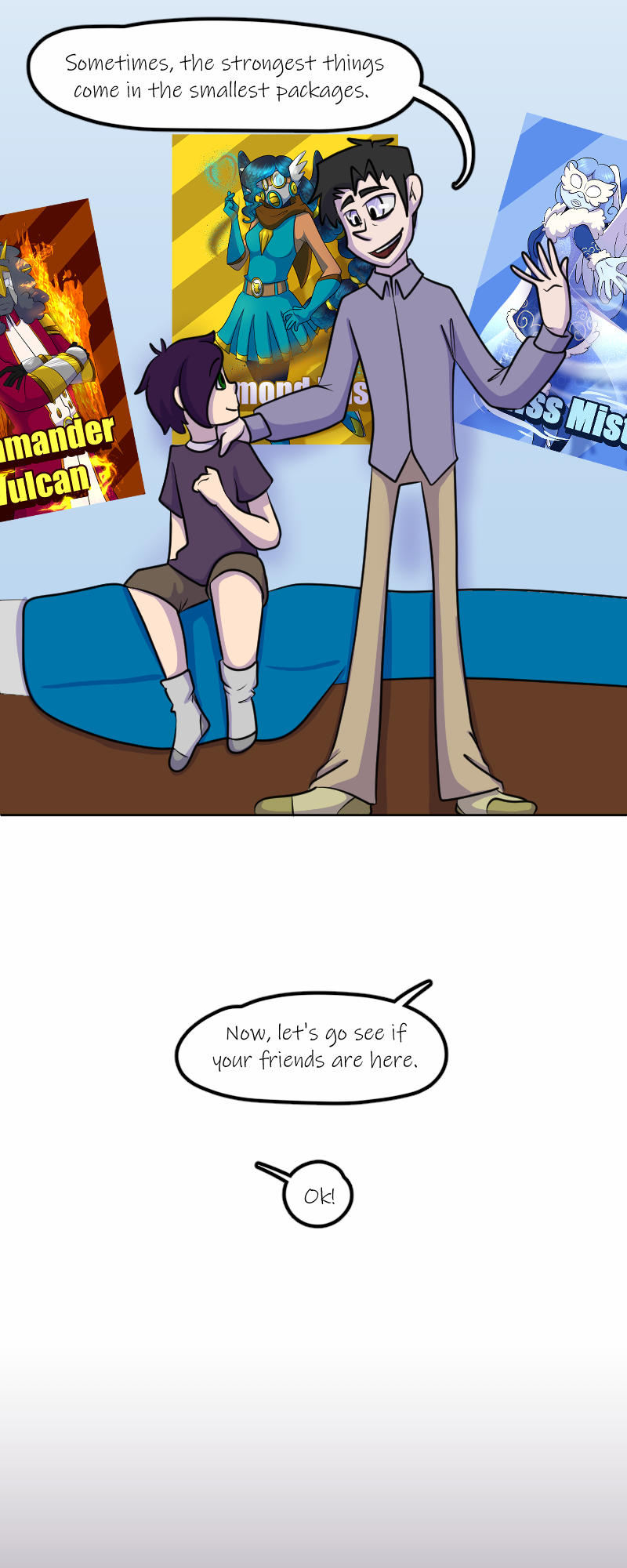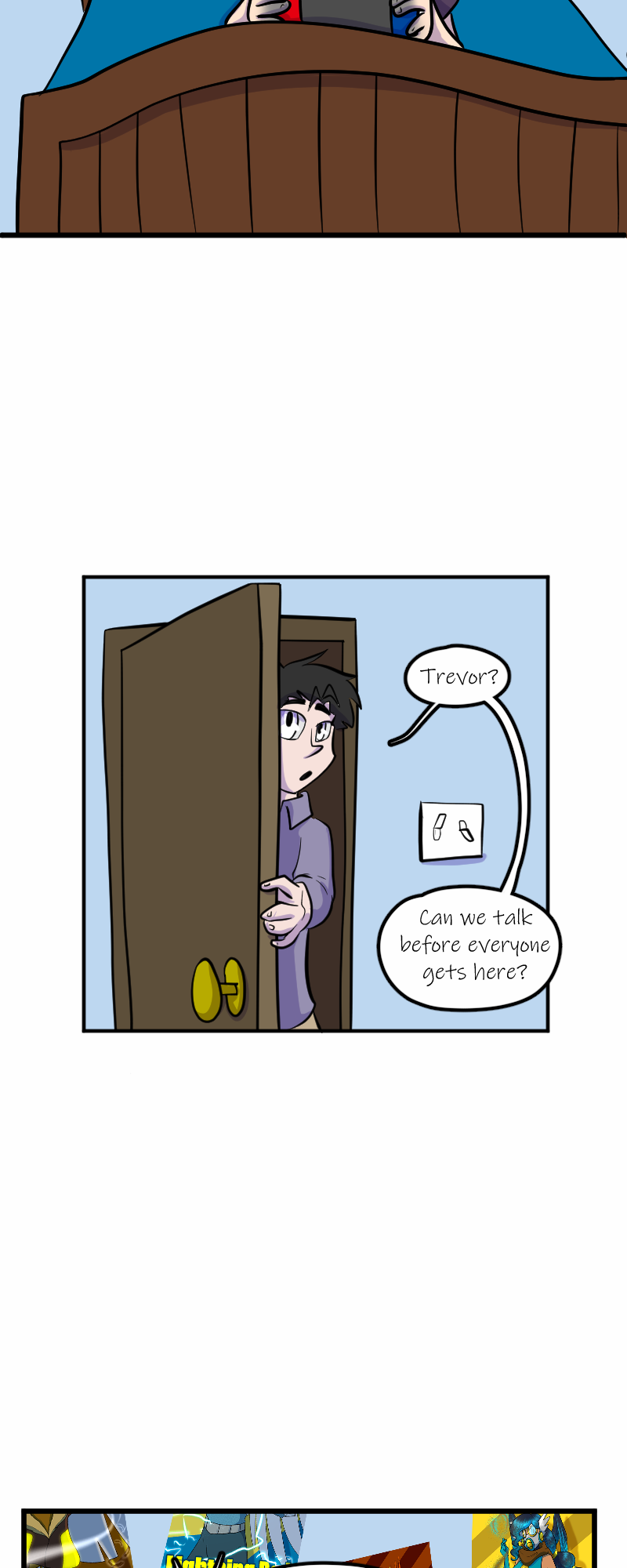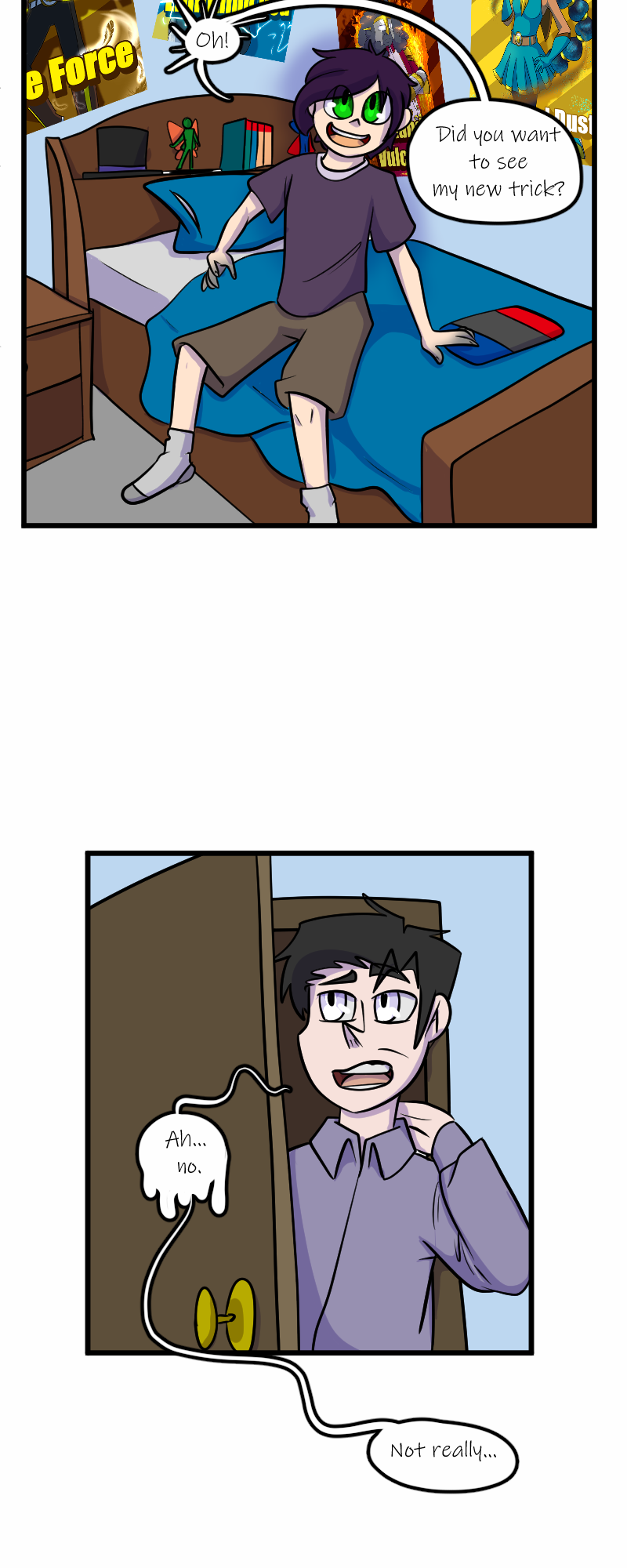 Aaaaand we're back! Sorry for the delay - got our fingers crossed that we can keep up with the every other Wednesday schedule now that things are calming down. Next is Trevor's party! Wish him Happy Birthday! (Fun fact: Trevor's design Is six years old! He's turning 10 in the story, though. Simon's original concept is seven years old, and so is Kelly's.)