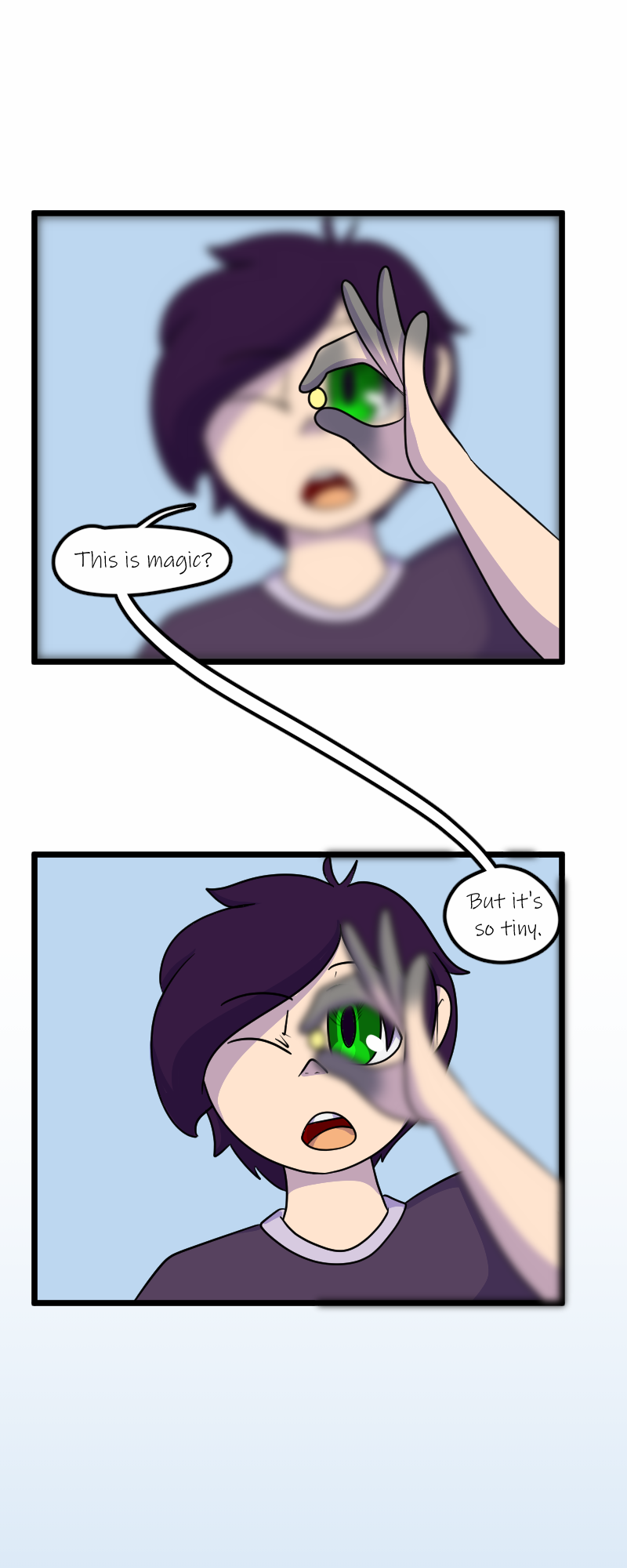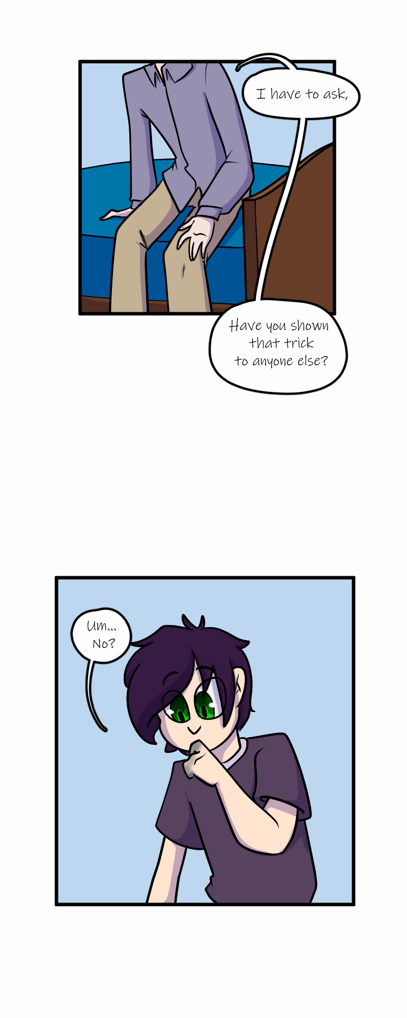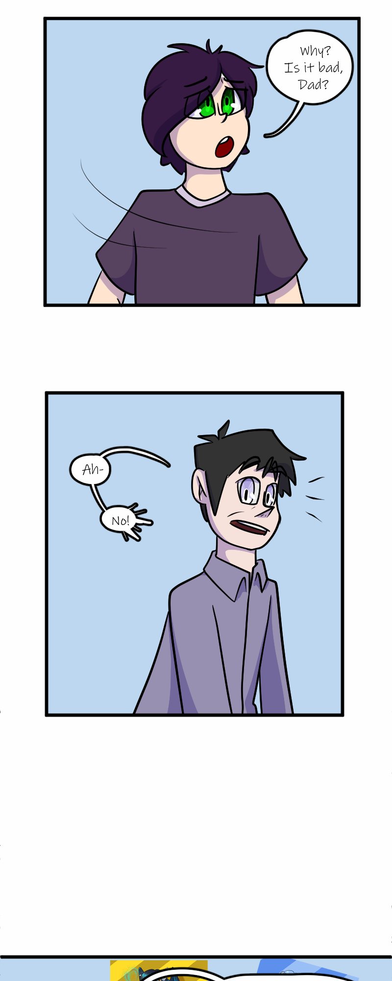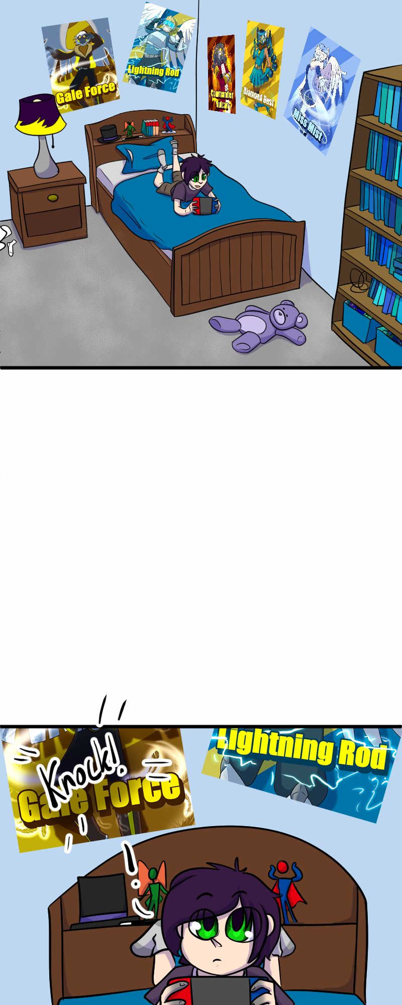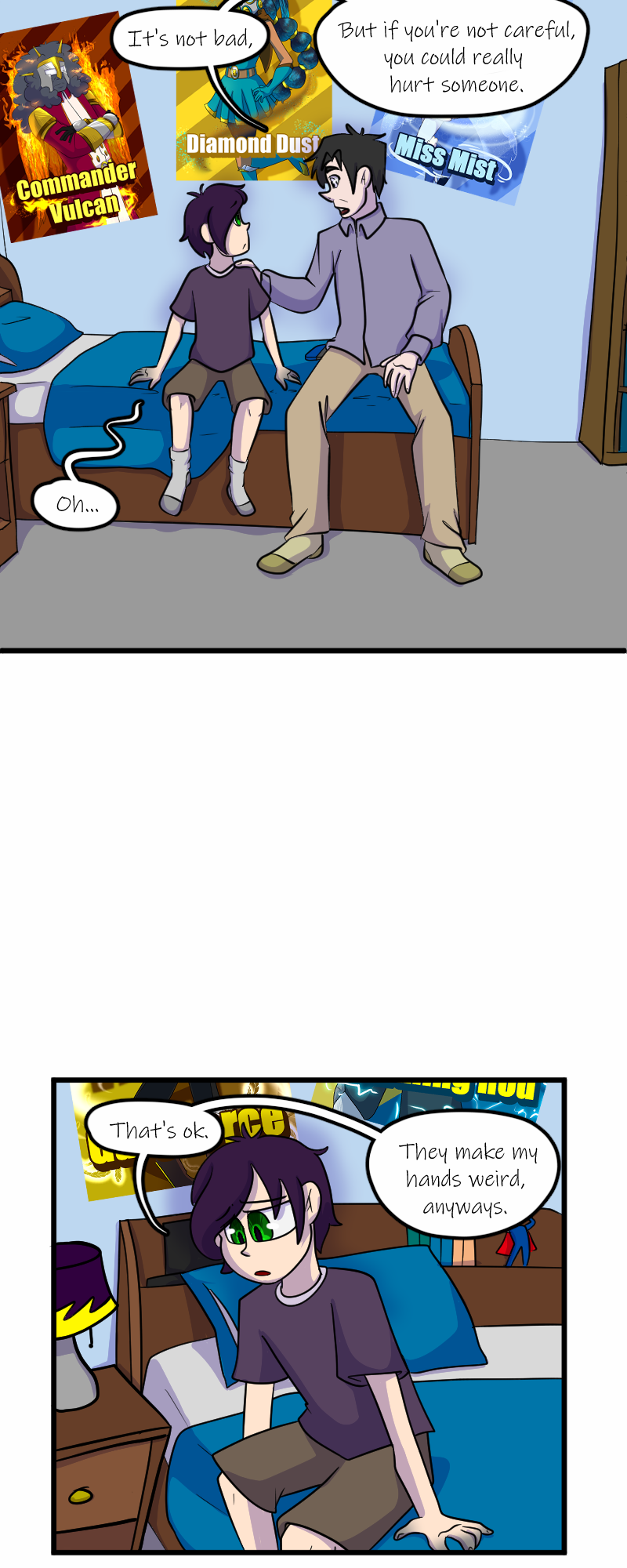 Aaaaand we're back! Sorry for the delay - got our fingers crossed that we can keep up with the every other Wednesday schedule now that things are calming down. Next is Trevor's party! Wish him Happy Birthday! (Fun fact: Trevor's design Is six years old! He's turning 10 in the story, though. Simon's original concept is seven years old, and so is Kelly's.)