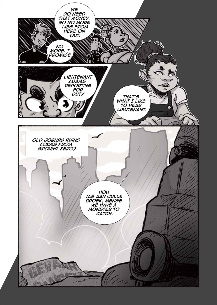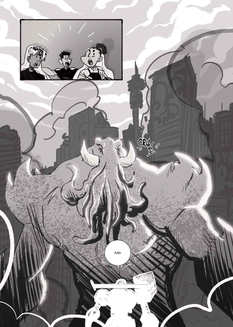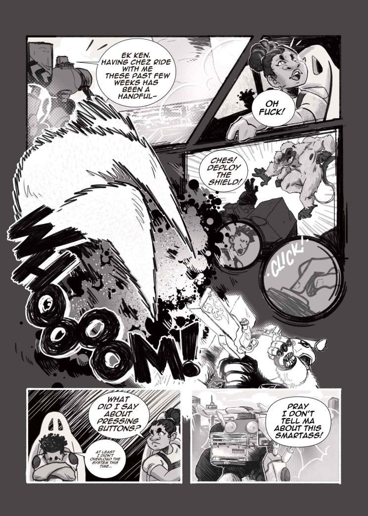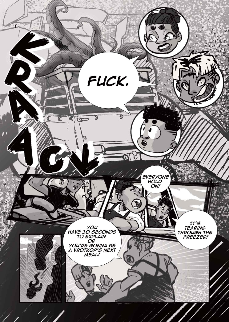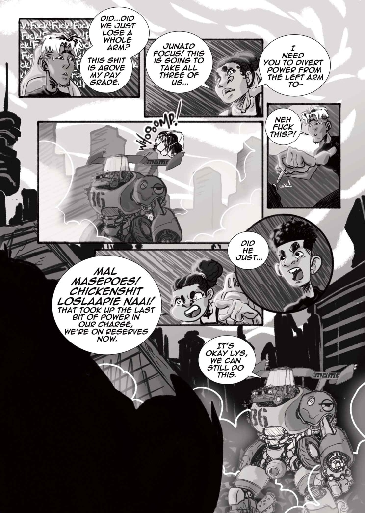 Limited only to 22 pages and shades of black, white and grey, our students dove into the world of Seinen and Kaiju, creating poignant yet fantastical representations of the young, African psyche. We begin with Did You Know? A ‘be careful what you wish for’ storyline about a pair of nemeses, who are forced to confront their differences with nobody but themselves to turn to. Then, we move on to Lens, a story about class, conflict, and the cost of friendship between best-friends Rhea and Thandi. Finally, we welcome Super Mega Afro-Mecha Poesklap! Where car culture and radioactive fallout converge into a mech-courier adventure in Old Jozi.