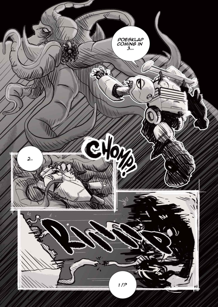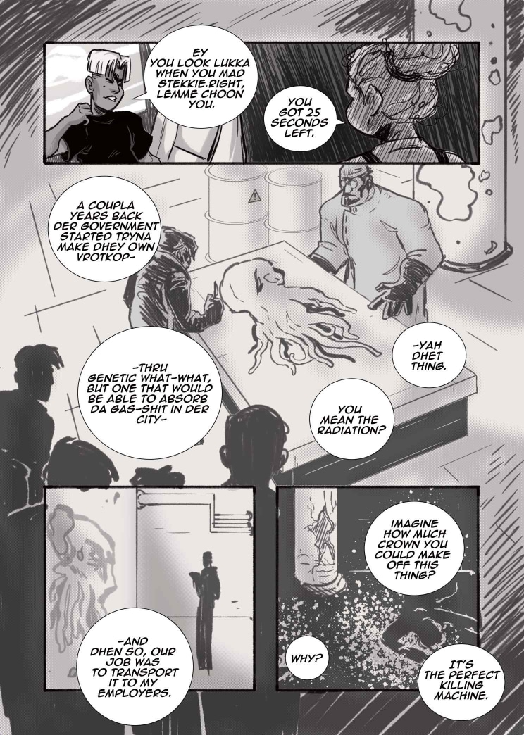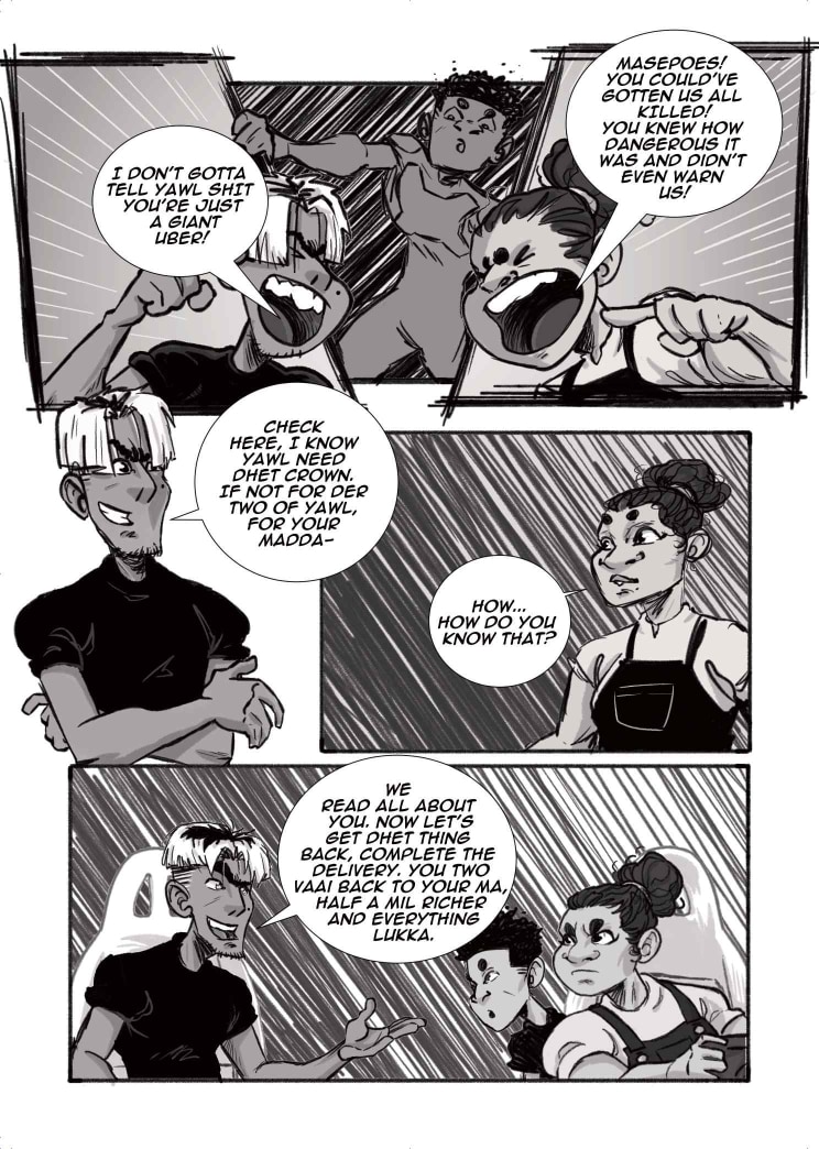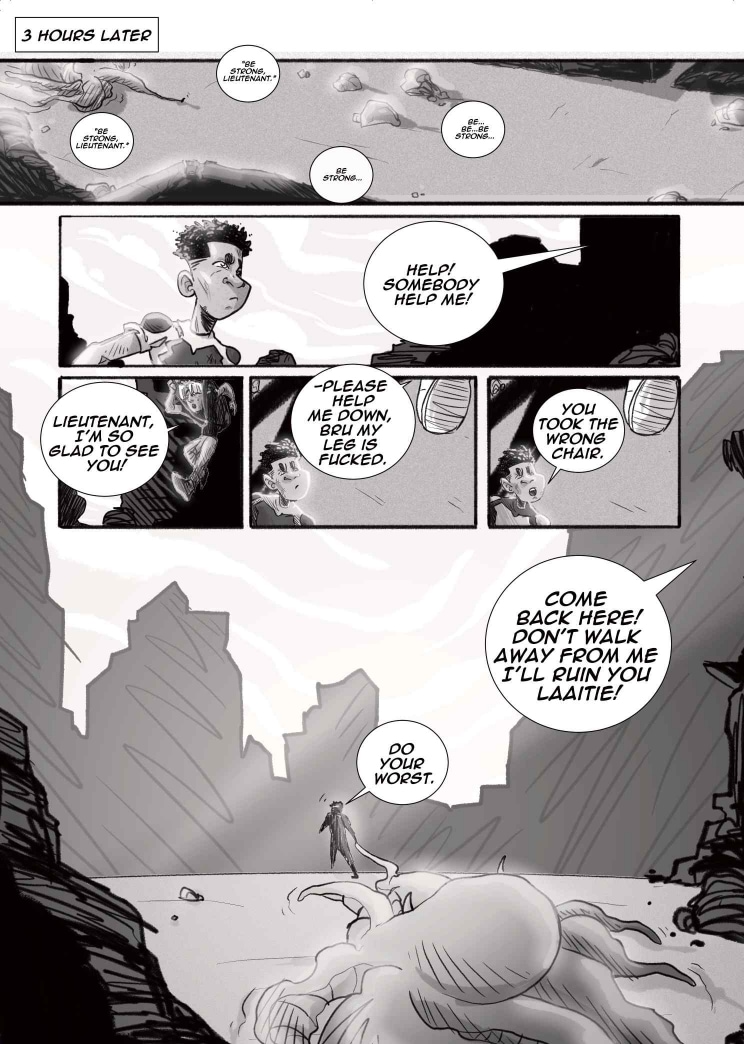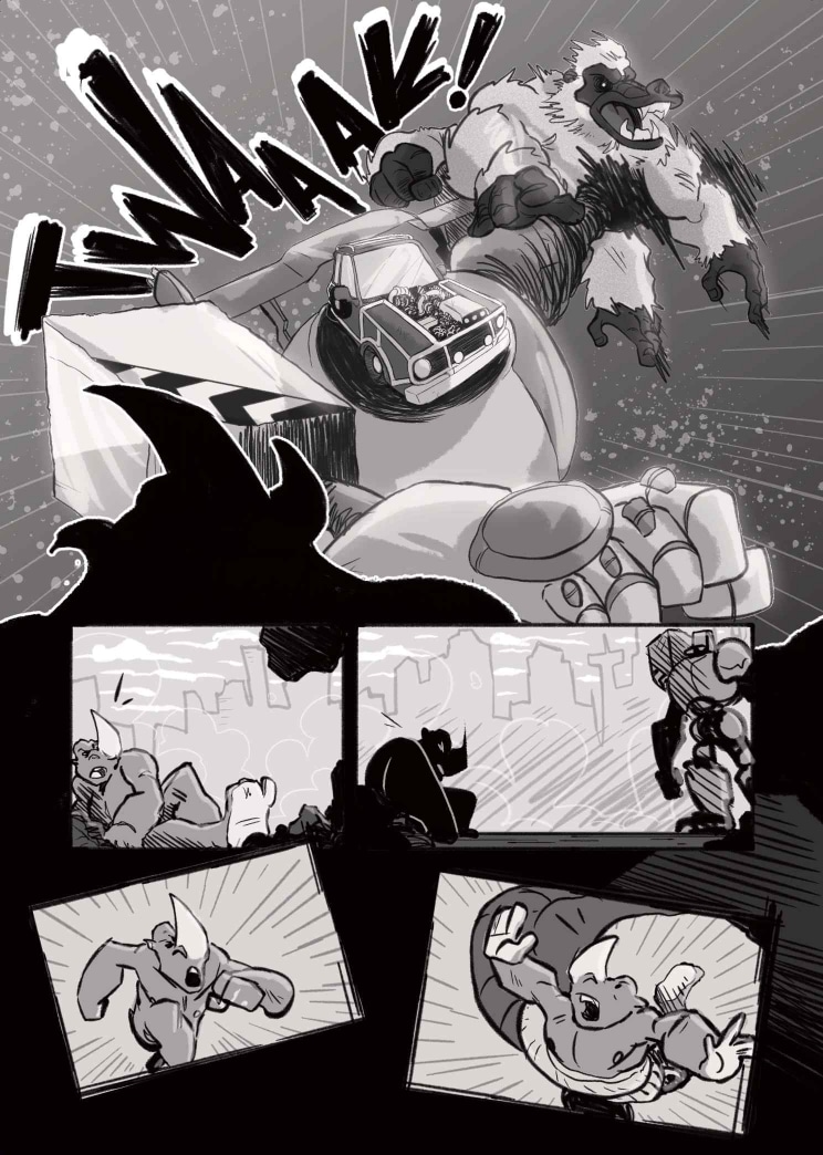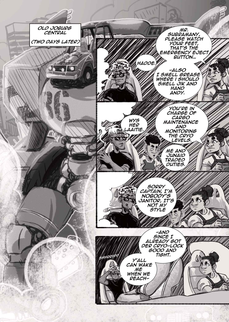 Limited only to 22 pages and shades of black, white and grey, our students dove into the world of Seinen and Kaiju, creating poignant yet fantastical representations of the young, African psyche. We begin with Did You Know? A ‘be careful what you wish for’ storyline about a pair of nemeses, who are forced to confront their differences with nobody but themselves to turn to. Then, we move on to Lens, a story about class, conflict, and the cost of friendship between best-friends Rhea and Thandi. Finally, we welcome Super Mega Afro-Mecha Poesklap! Where car culture and radioactive fallout converge into a mech-courier adventure in Old Jozi.