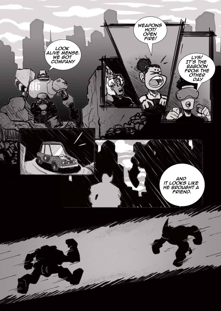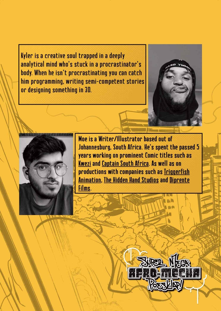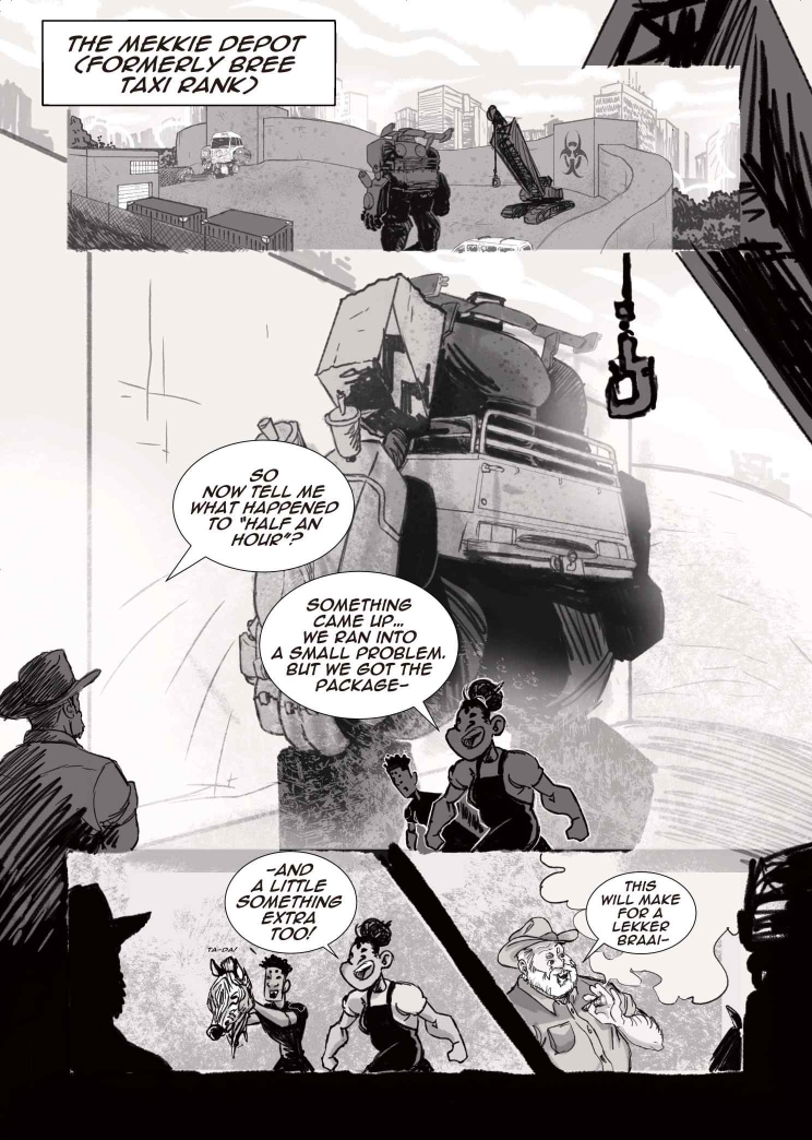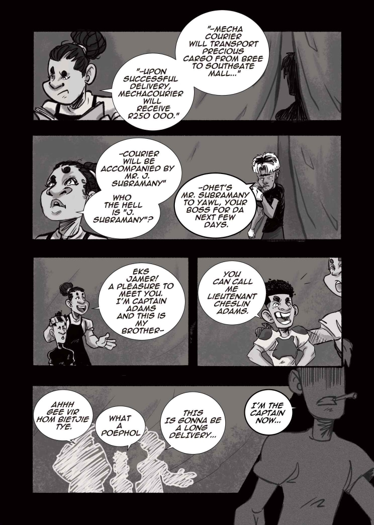 Follow siblings, Alyssa and Cheslin Adams, who operate as Mech-couriers in the post-nuclear wasteland of ‘Old Jozi’. After a string of shitty piece jobs, the siblings get the chance to make a cool half-mill on a transport job. However, accompanying them is Junaid, an arrogant blowhard whose incompetence sends the mission into a tailspin.