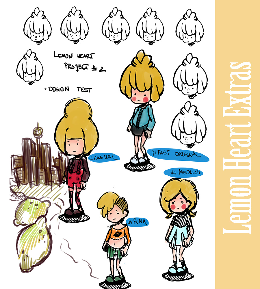 LH Extras - Part 1 Since Im really busy with school and stuff I just feel bad cause' I upload nothing. So I decided I show you some of Lemon Hearts development. This is a sheet I tried a year before. The Original Lemon is not quiet on this sheme. But I will upload these days the real picture of her. I tried many styles and thought about diffrent noses. In the End I kinda choose a mixed style. Why a girl? Cause I like girls, and I think I could relate more to her since she is a part of my heart. (Don't wanted to rhyme that, sorry guys..) When I first tought of the Idea of Lemon Heart in the hospital I knew I wanted a blond little girl with casual clothes....
