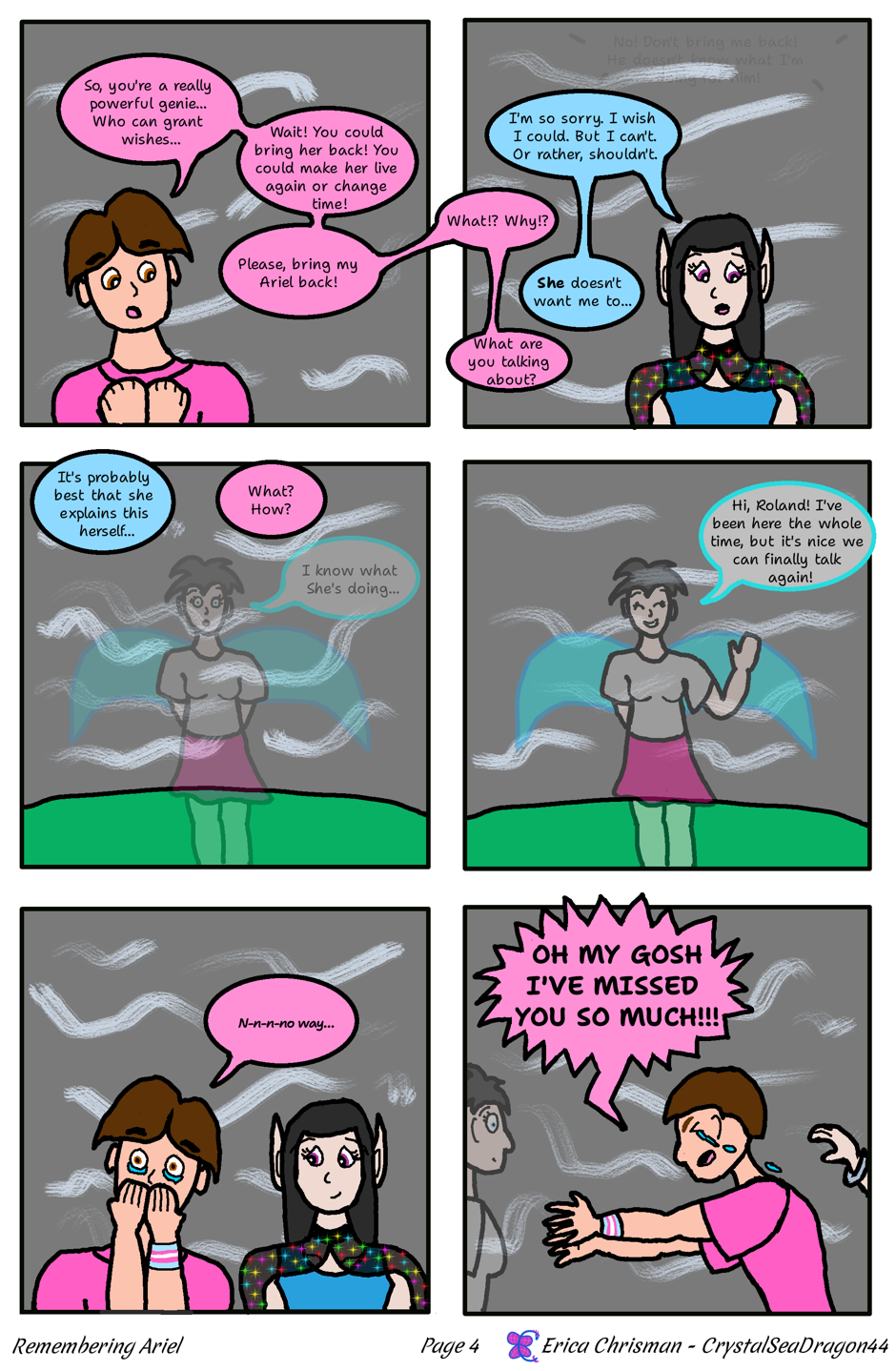 The counterpart to the genie Ariel we've been seeing, her appearance is from her last day - plus some wings (that gets explained next page). Of course, as a spirit, the real her shines through, and she no longer has the male body she was born with.
