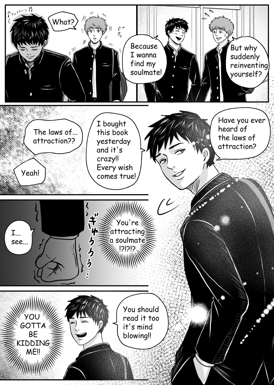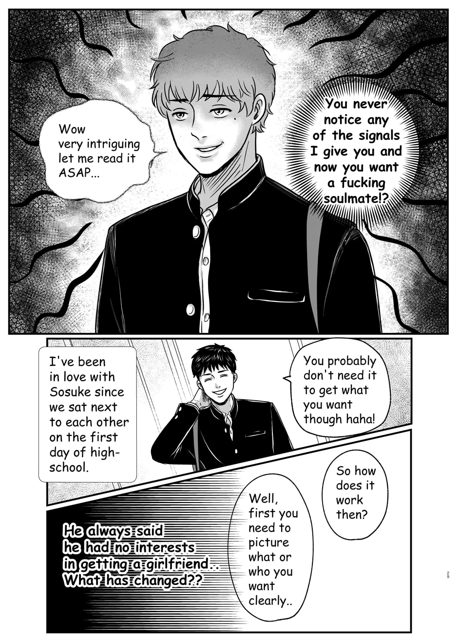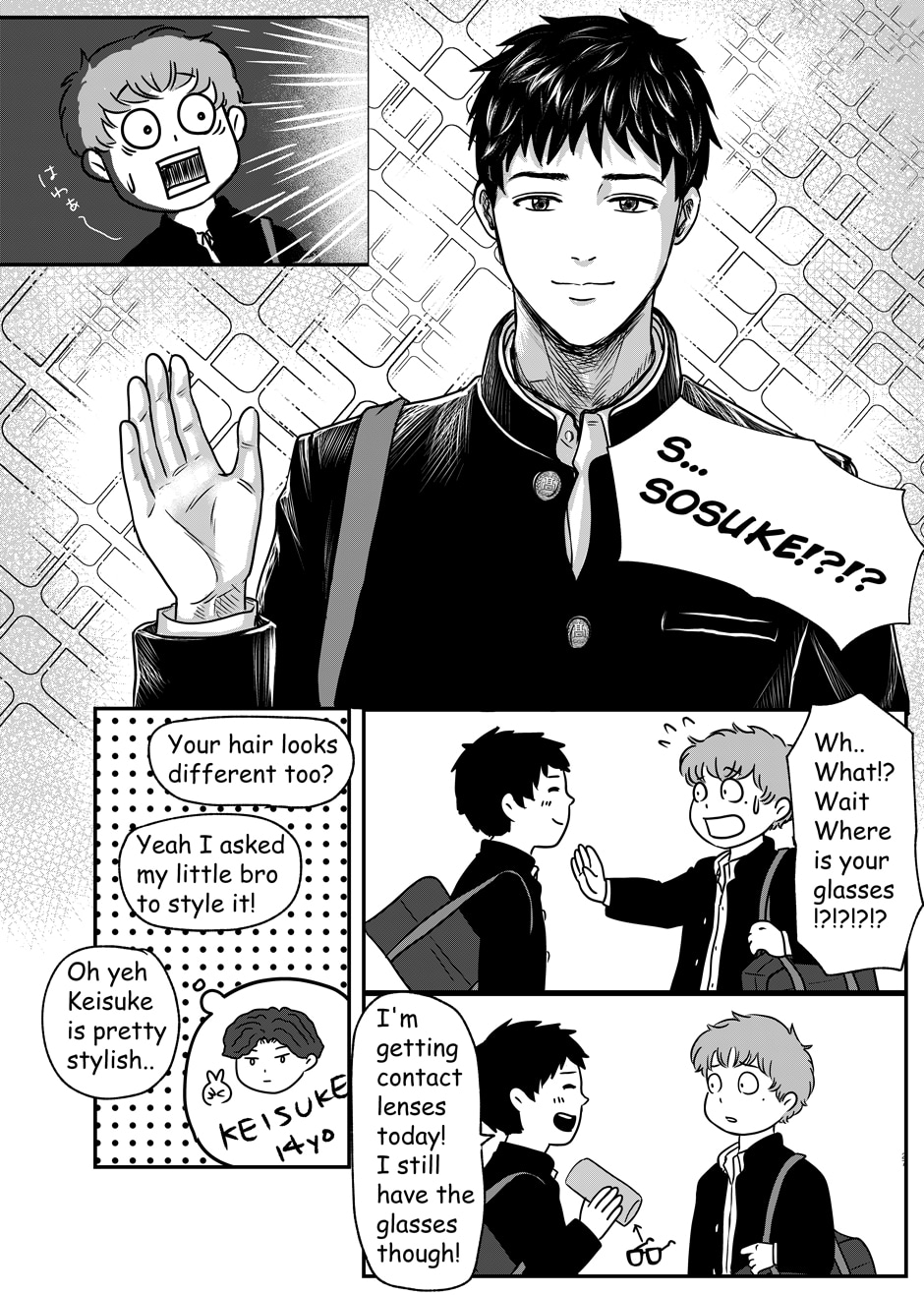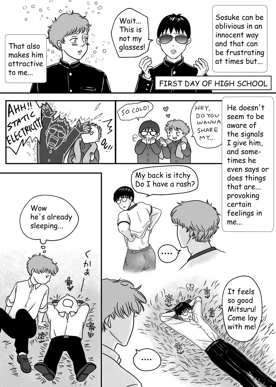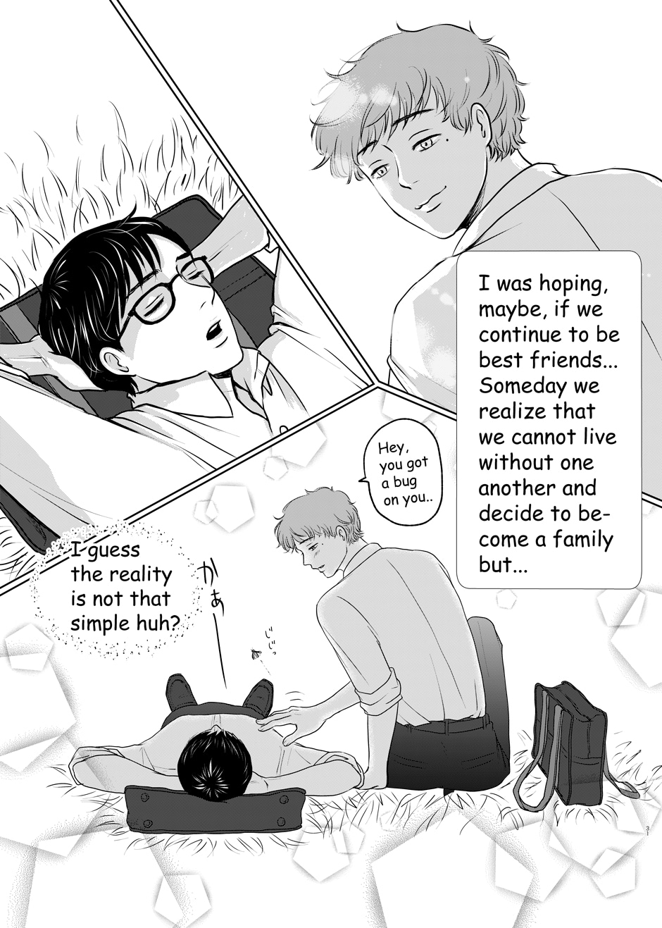 Sosuke Nogami can't think of anything interesting to say about him, but he has one thing that he can be proud of. That is his best friend, Mitsuru Hayama, who is the best looking guy he ever saw (in his own words). They have been inseparable ever since they met, but one day, Sosuke finds out Mitsuru has a secret crush. From the fear of being left alone, Sosuke decides to find himself a partner before Mitsuru gets one.