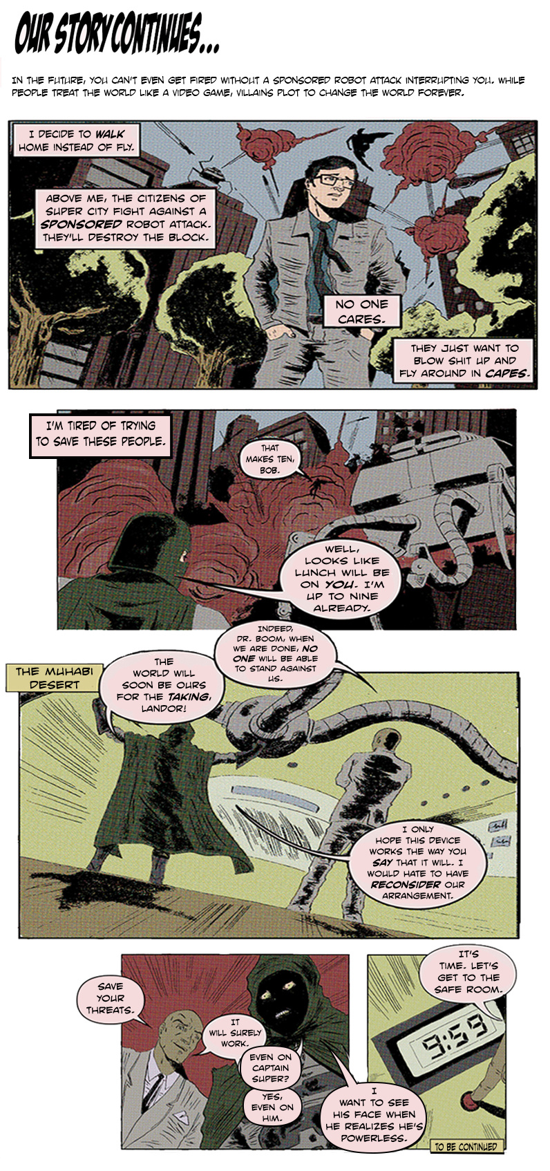 Jake Guy walks home while his boss, and many others, fight robots in Super City. Little does he know, the whole world is about to change.