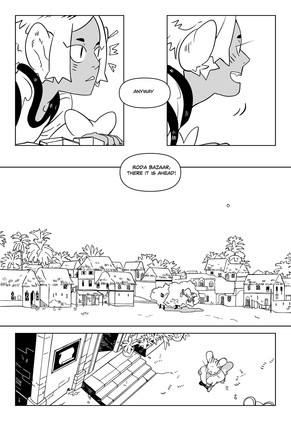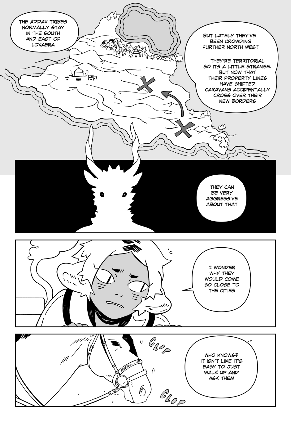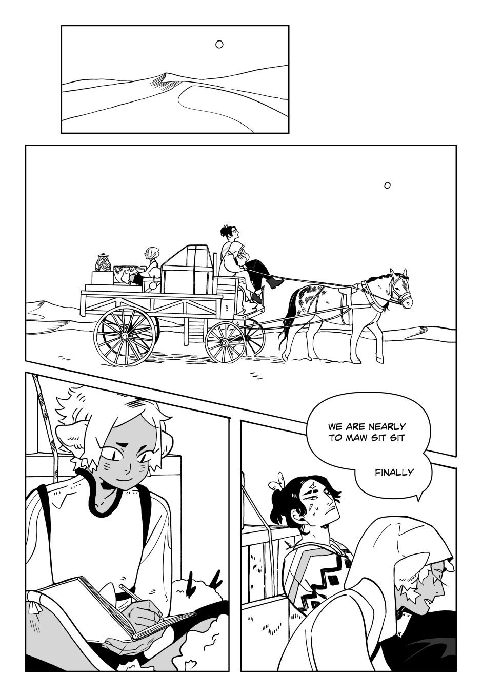 The human sitting in the front is a Crow! Felithera (Lions, Tigers, Panthers) are all naturally quite a bit shorter than Humans. So if a smaller race wants some extra muscle around, it's time to make a bigger friend! Crows are from the northern mountains, so the heat of the desert is probably really getting to him.