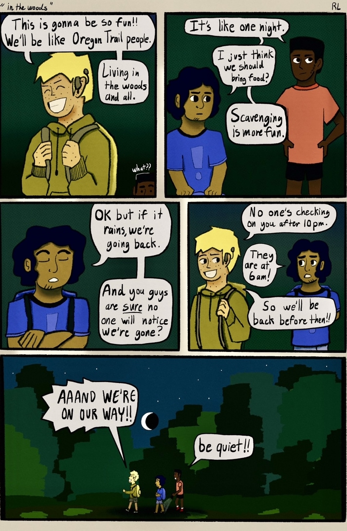 This first more-than-two-page-arc is named after the album that inspired this whole thing—How To Survive In In The Woods (Woods, released 2007).