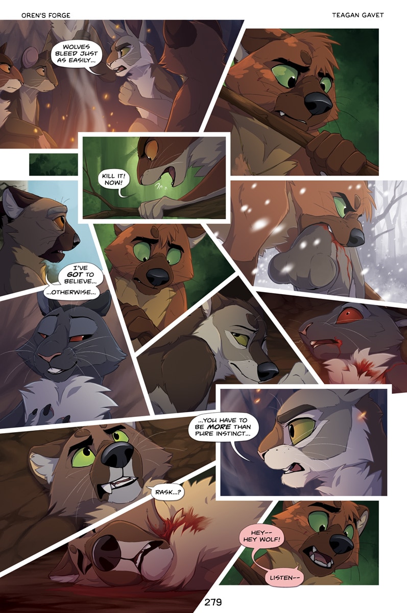In the scene with Oren that Rask is recalling (pg 241) Oren is speaking to the other prey animals specifically, about how not to give in to their instinctual fear. However, I knew Rask would interpret his words in his own way and internalize them. This whole page is about the small parts of the whole we take away and what we make of it, even when something isn't meant specifically for us.