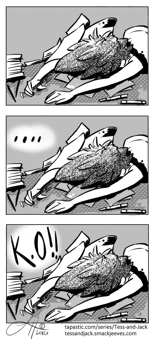 I dropped the ball twice on a Tess and Jack page because I'm a Terrible Person. I am so, so sorry. Work has been crazy lately, and I'm getting ready for two conventions that are pretty much one right after the other. Anyway, thank you for your patience, Tess and Jack will return soon!