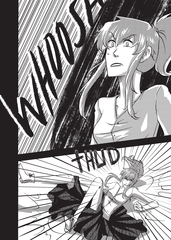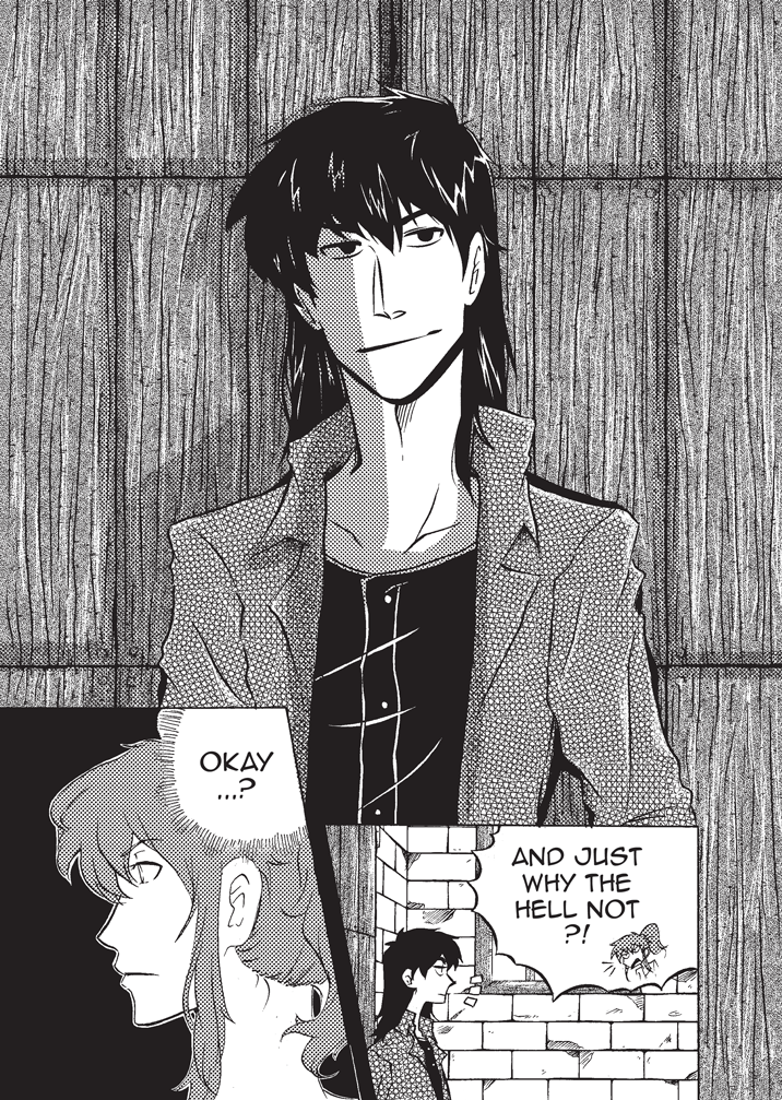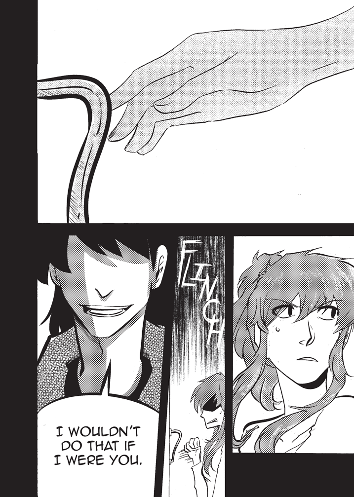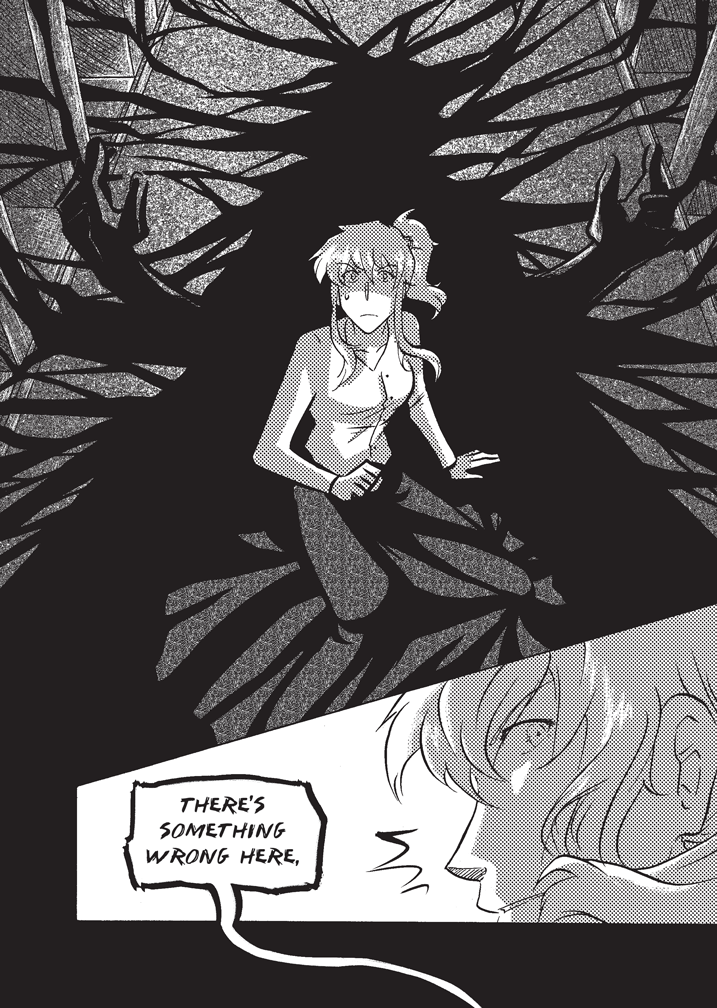 I like the looks of your characters also this idea with using symbol to communicate "flip your phone" is cool idea though it really doesn't need to be so "big" and take up space between pages because the red and symbol are easy not to miss.