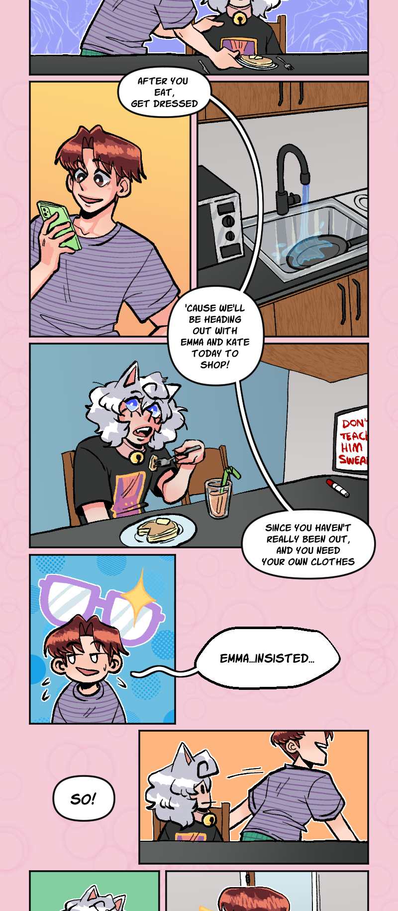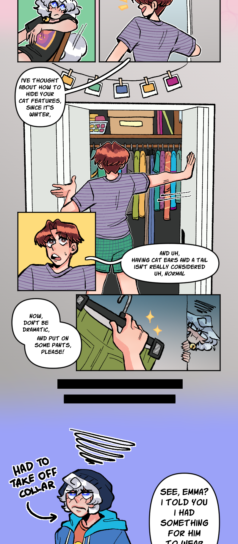 We're back! I decided due to school and life at the moment, and me not wanting this to be on hiatus for who knows how long, I'm just going to keep this webcomic off of a schedule. As in, episodes will be posted as they're finished, and not consistently, so sorry about no more Monday weekly uploads! This was just the best I could do to keep this going since I can't draw on a consistent schedule!