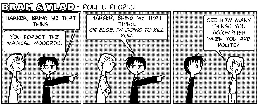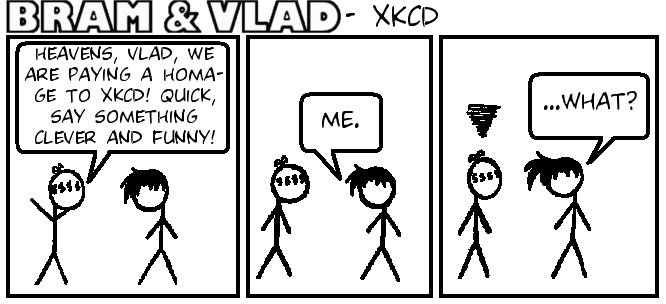 Bram is Abraham Van Helsing IV and Vlad is Vlad Dracula II. Against all odds, they become friends, bicker a lot and have to face all the trouble normal children/teens would and the odd furious vampire. WARNING: This comic contains geeks, vampires and people unwisely falling in love. Proceed with care.